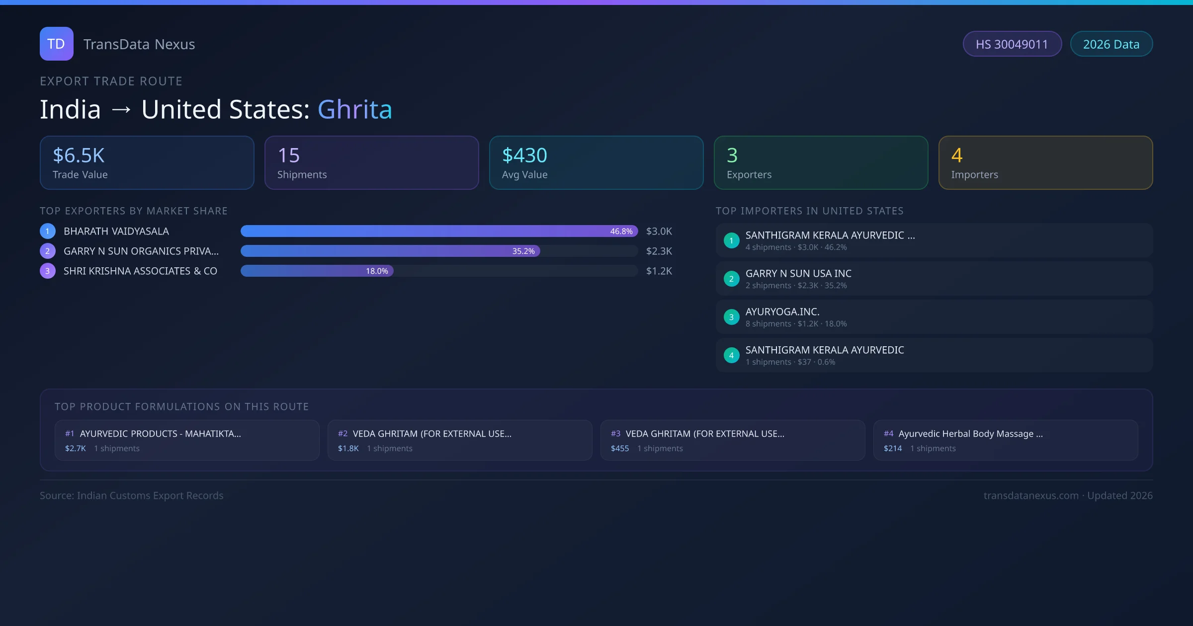 India has recorded 15 verified shipments of Ghrita exported to United States, representing a combined trade value of $6.5K USD. This corridor is served by 3 active Indian exporters, with an average shipment value of $430 USD. The leading Indian exporter is BHARATH VAIDYASALA, which accounts for 47% of total export value with 5 shipments worth $3.0K USD. On the buying side, SANTHIGRAM KERALA AYURVEDIC CO OF is the largest importer in United States with $3.0K USD in purchases. The top 3 suppliers — BHARATH VAIDYASALA, GARRY N SUN ORGANICS PRIVATE LIMITED, SHRI KRISHNA ASSOCIATES & CO — together control 100% of total trade value on this route. All data sourced from Indian Customs (DGFT) shipping bill records. Values reported in FOB USD.