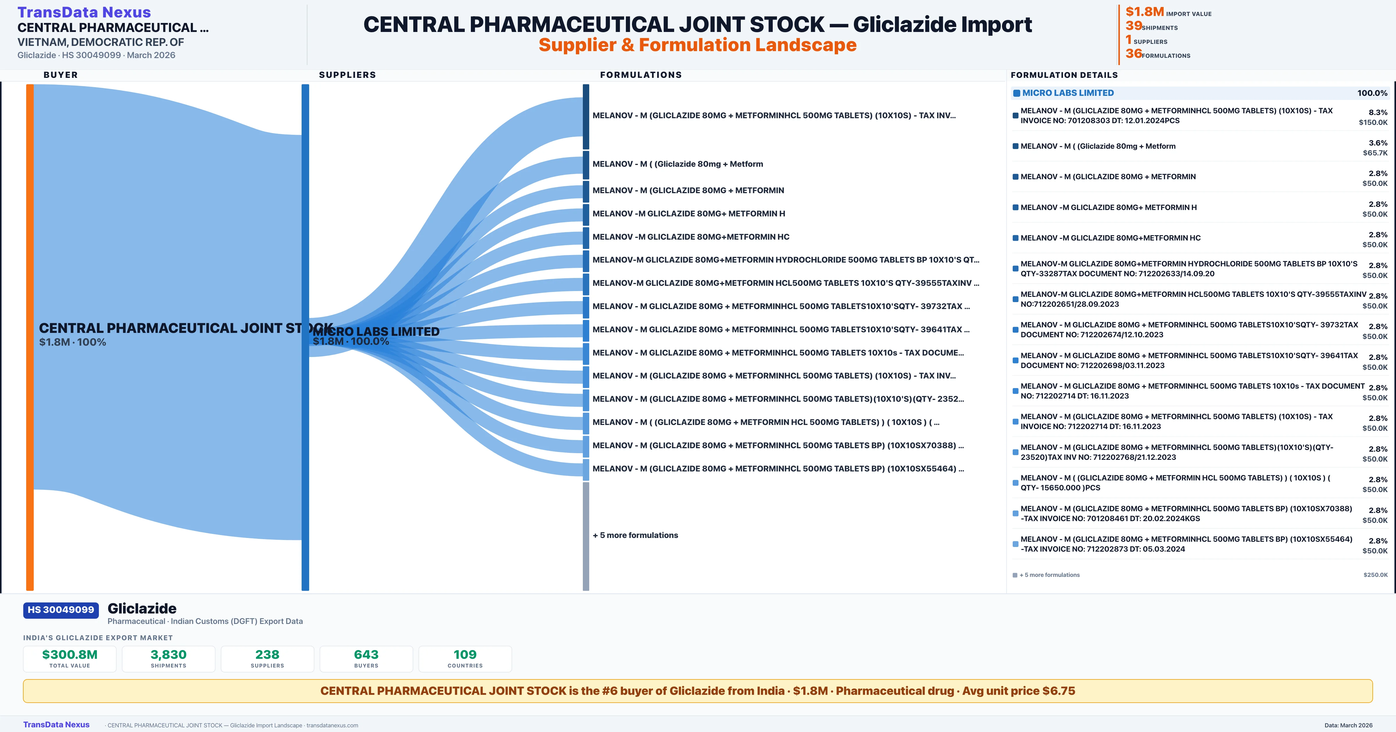 CENTRAL PHARMACEUTICAL JOINT STOCK imports 36 distinct Gliclazide formulations from India. The top formulation is MELANOV - M (GLICLAZIDE 80MG + METFORMINHCL 500MG TABLETS) ( with 3 shipments worth $150.0K.