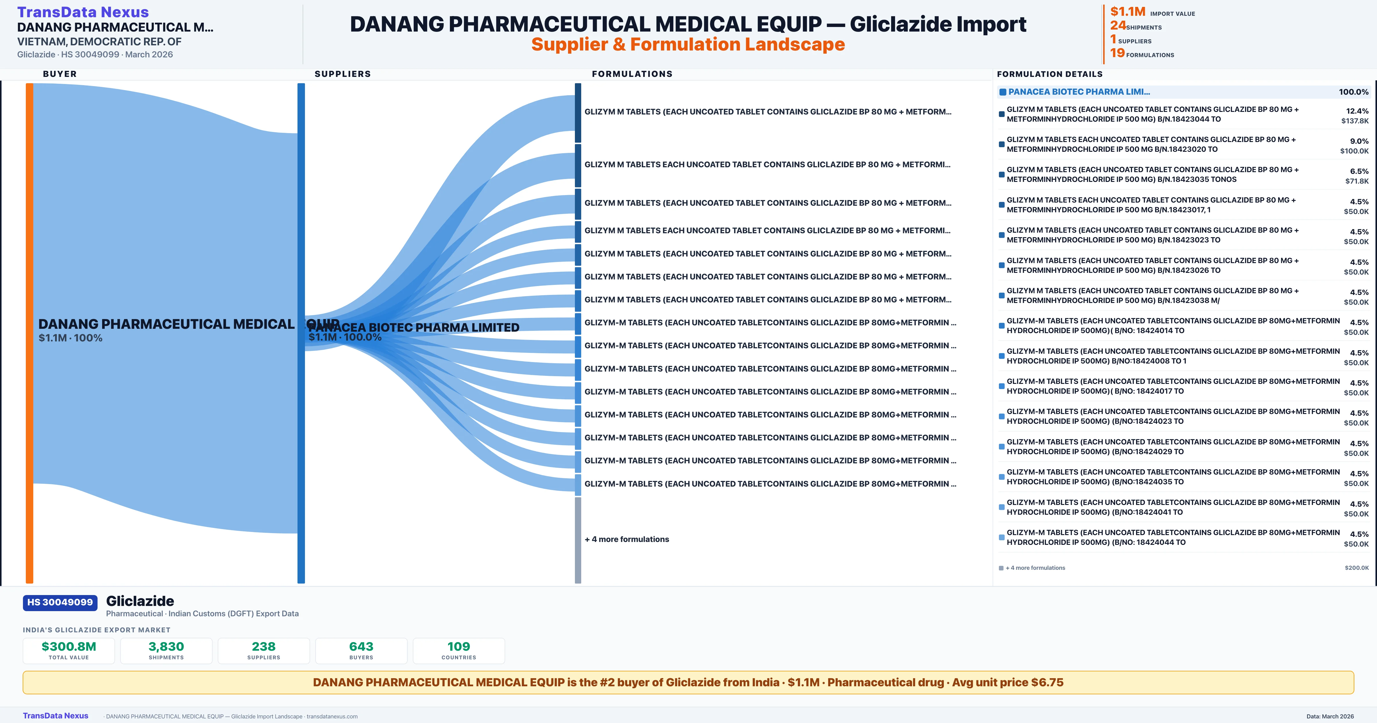 DANANG PHARMACEUTICAL MEDICAL EQUIP sources Gliclazide from 1 verified Indian supplier: PANACEA BIOTEC PHARMA LIMITED ($1.1M, 100.0%). This is based on 24 customs records.