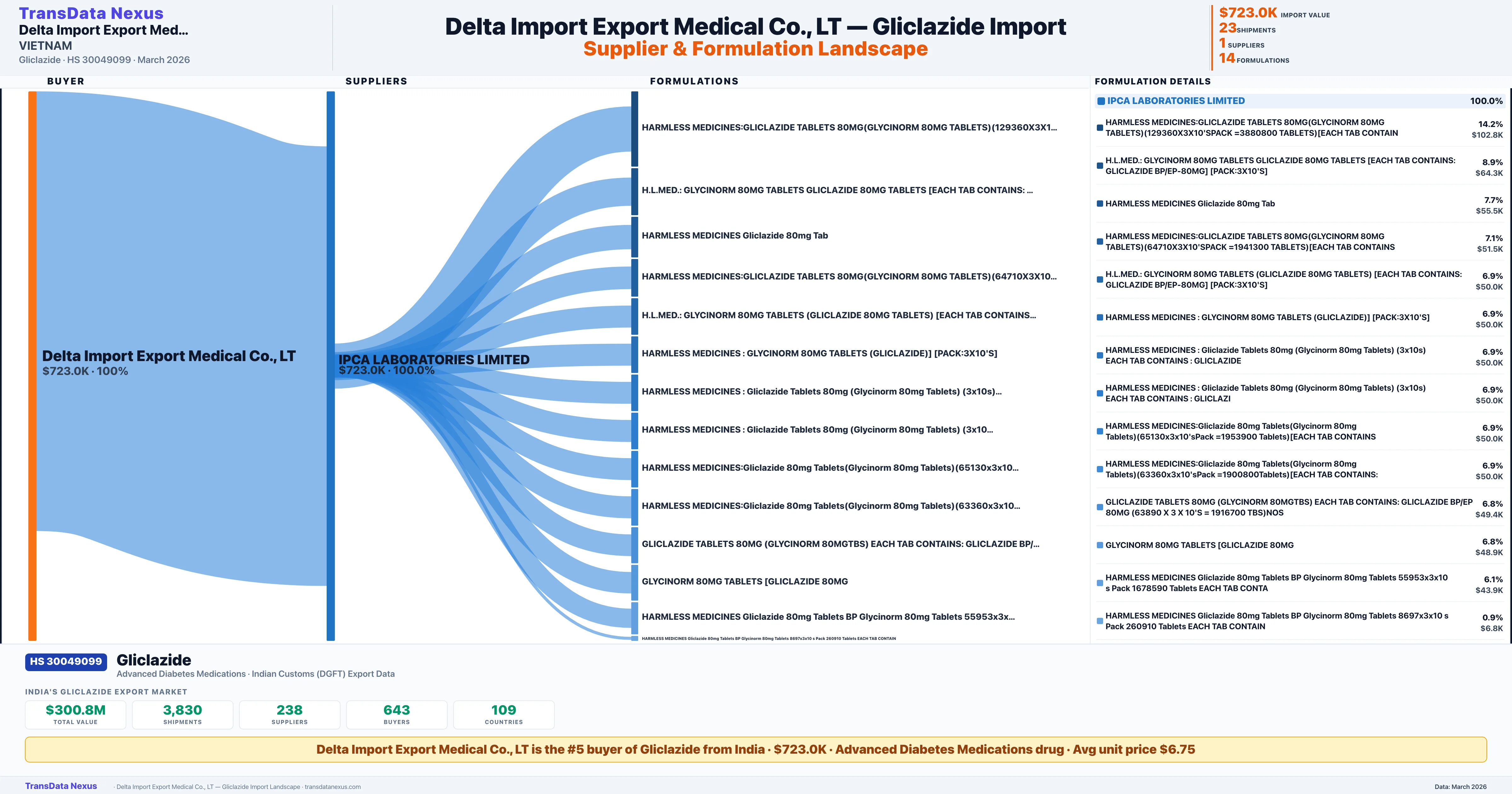 DELTA IMPORT EXPORT MEDICAL CO., LT sources Gliclazide from 1 verified Indian supplier: IPCA LABORATORIES LIMITED ($723.0K, 100.0%). This is based on 23 customs records.