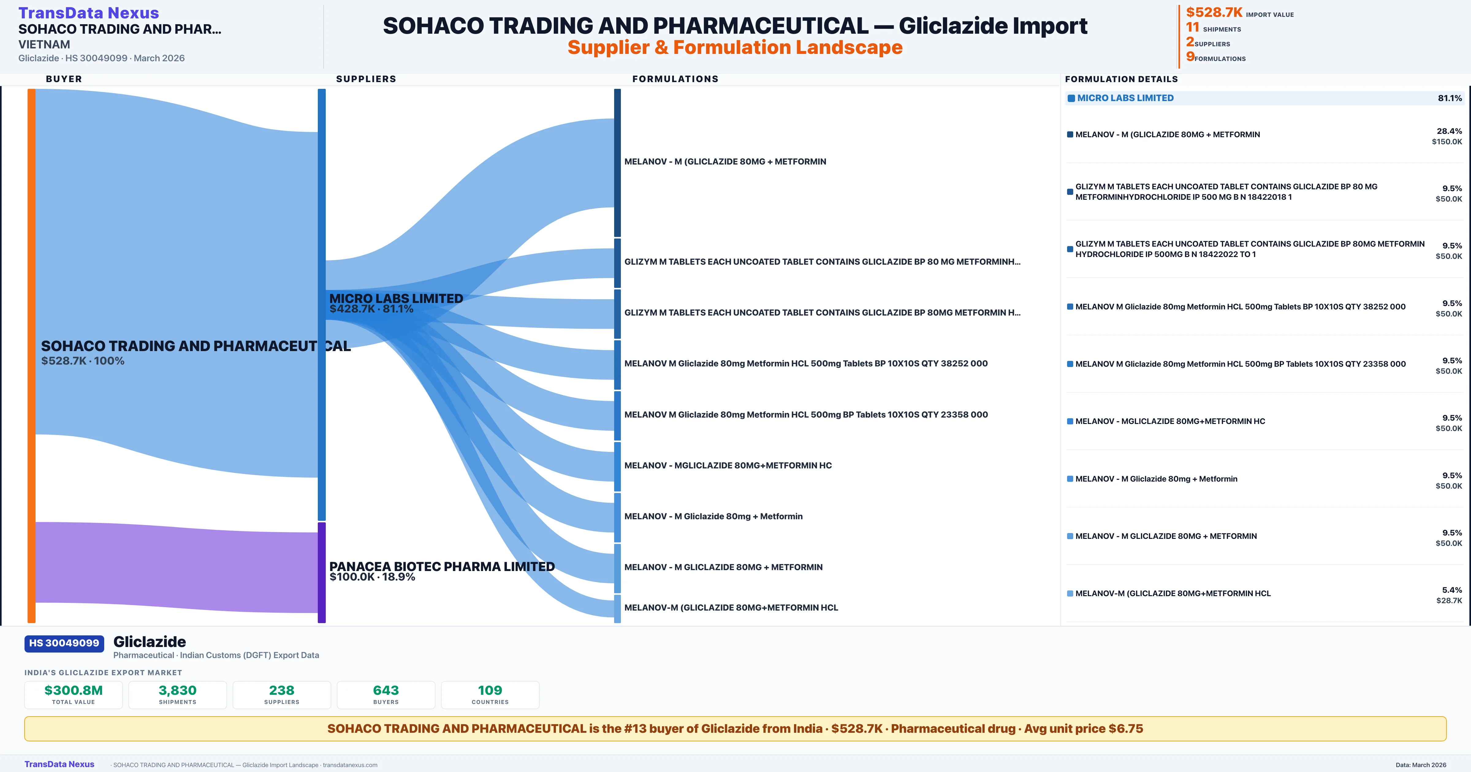 SOHACO TRADING AND PHARMACEUTICAL sources Gliclazide from 2 verified Indian suppliers: MICRO LABS LIMITED ($428.7K, 81.1%), PANACEA BIOTEC PHARMA LIMITED ($100.0K, 18.9%). This is based on 11 customs records.