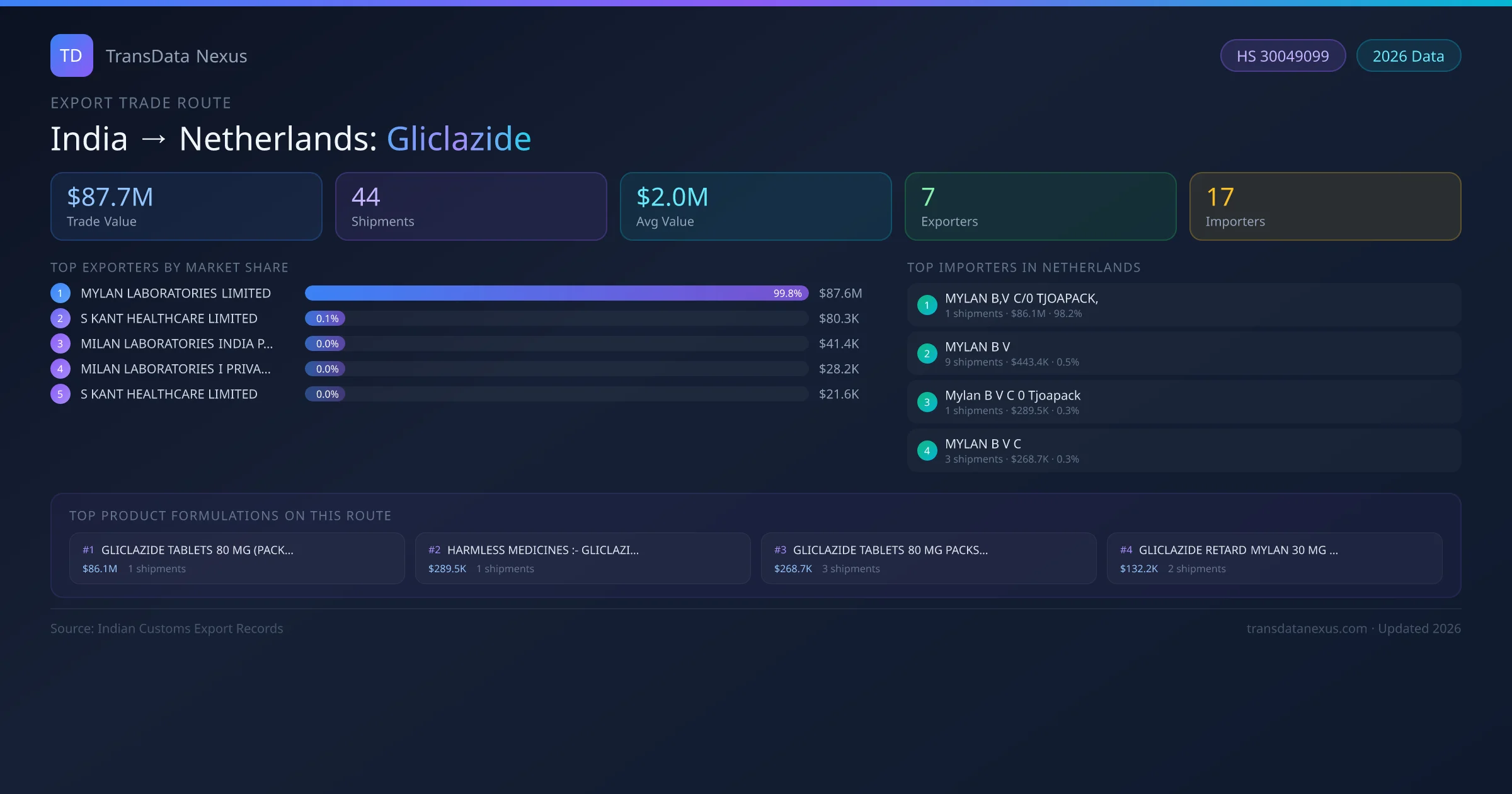 The India to Netherlands Gliclazide corridor is one of India's established pharmaceutical export routes, with 44 shipments documented worth a combined $87.7M USD. The route is dominated by MYLAN LABORATORIES LIMITED, which alone accounts for roughly 100% of all export value, reflecting the consolidated nature of India's gliclazide manufacturing sector.