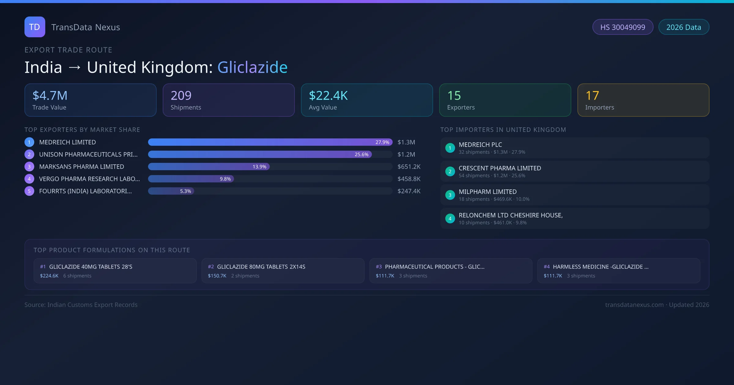 On the import side, key buyers of Indian gliclazide in United Kingdom include MEDREICH PLC, CRESCENT PHARMA LIMITED, MILPHARM LIMITED and 14 others. MEDREICH PLC is the single largest importer with 32 shipments valued at $1.3M USD.
