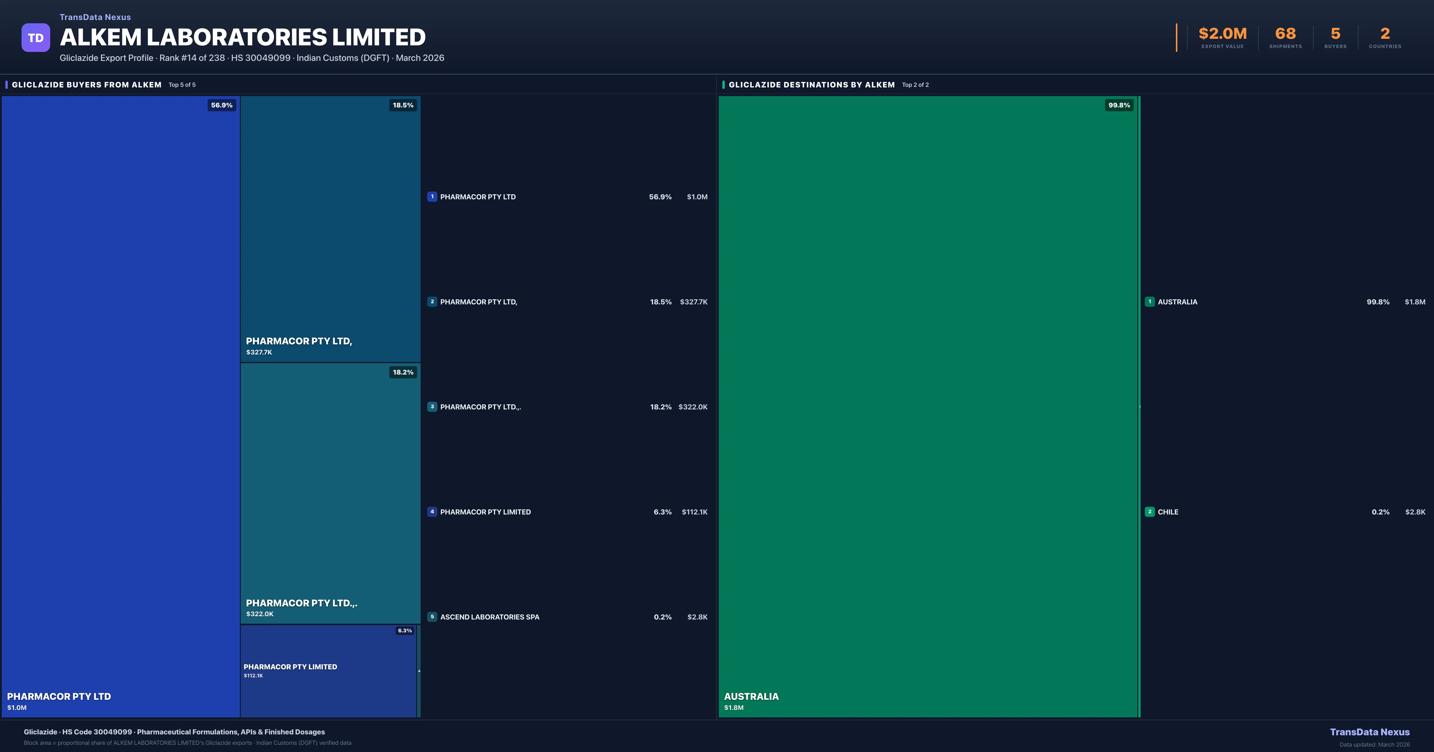 Alkem Laboratories Limited exports Gliclazide to 2 countries. The largest destination is AUSTRALIA accounting for 99.8% of Alkem Laboratories Limited's Gliclazide shipments. These destinations reflect Alkem Laboratories Limited's established distribution network and regulatory approvals in key markets.
