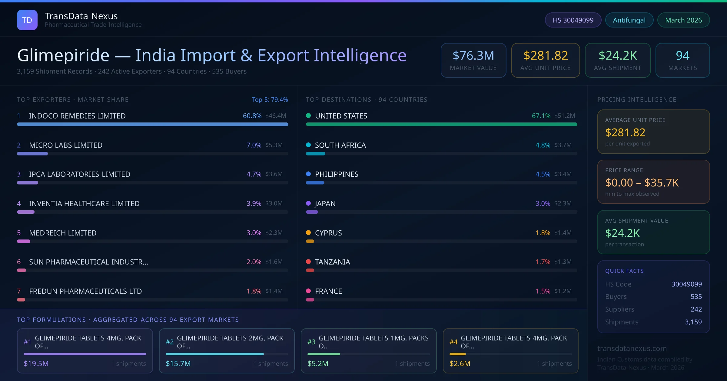 The total export value of glimepiride from India is $76.3M, recorded across 3,159 shipments from 242 active exporters to 94 countries. The average shipment value is $24.2K.