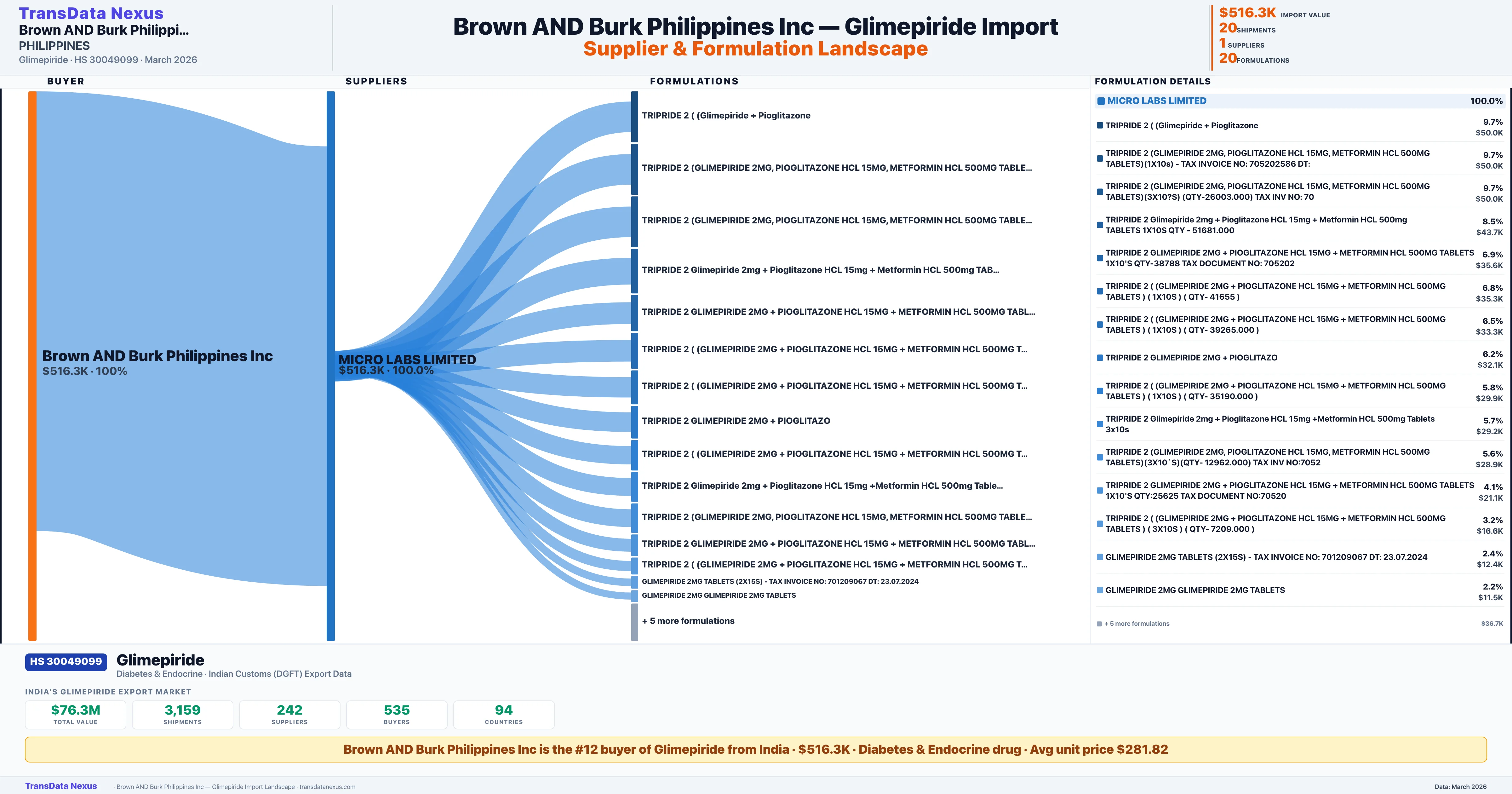 BROWN AND BURK PHILIPPINES INC sources Glimepiride from 1 verified Indian supplier: MICRO LABS LIMITED ($516.3K, 100.0%). This is based on 20 customs records.