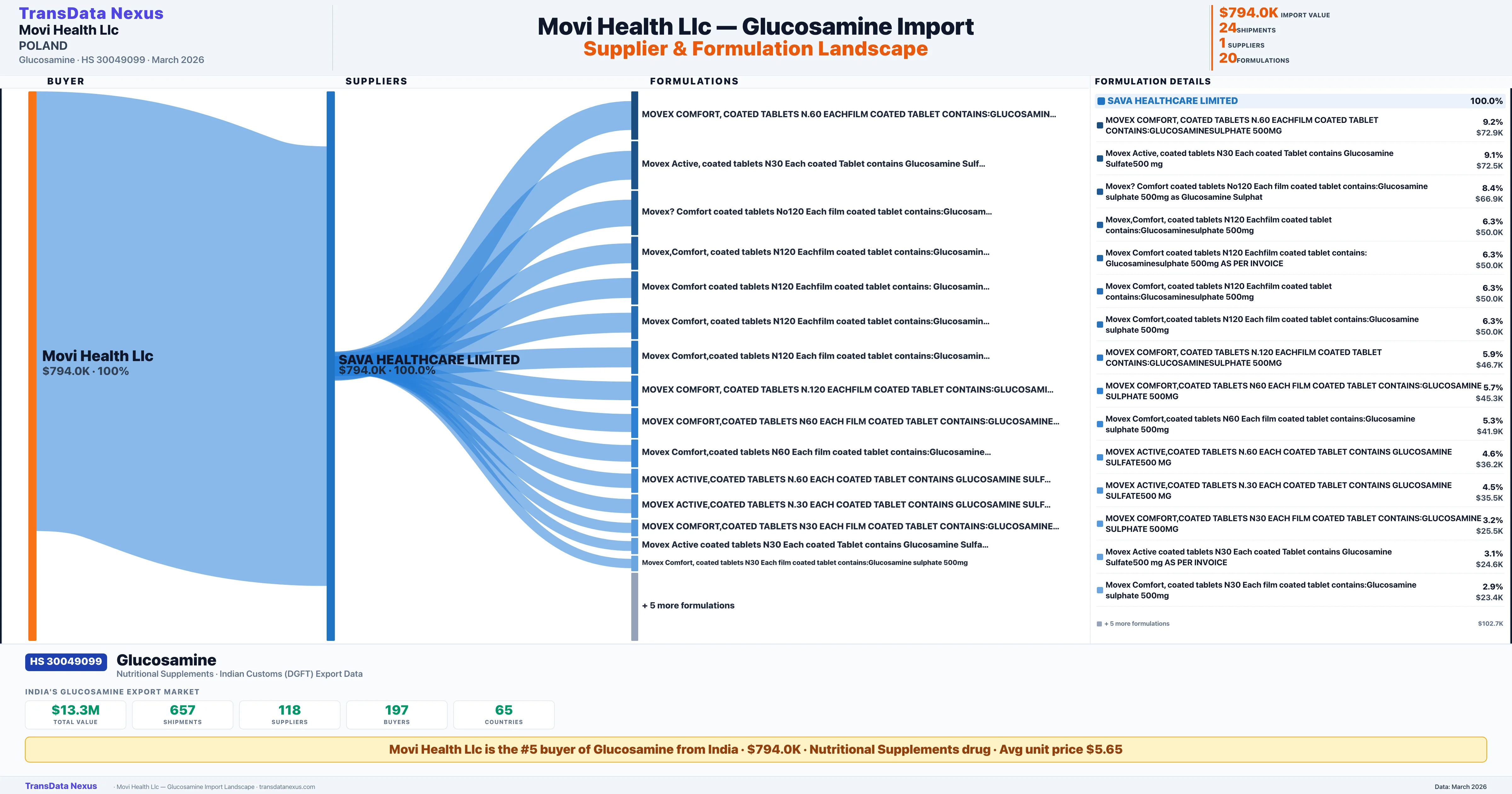 MOVI HEALTH LLC is the #5 importer of Glucosamine from India with $794.0K in import value and 24 verified shipments. MOVI HEALTH LLC holds a 6.6% market share in Glucosamine imports based in POLAND. The company sources from 1 verified supplier across 20 formulations shipped to 3 countries. Overall, MOVI HEALTH LLC imports 2 pharmaceutical products worth $1.7M across 2 therapeutic categories.