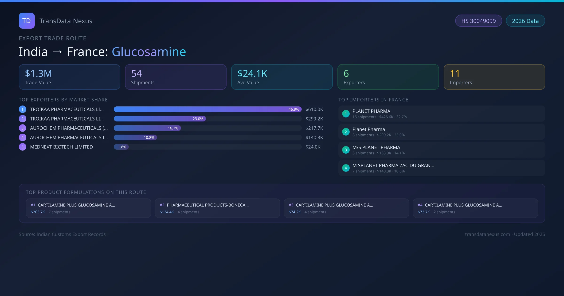 India has recorded 54 verified shipments of Glucosamine exported to France, representing a combined trade value of $1.3M USD. This corridor is served by 6 active Indian exporters, with an average shipment value of $24.1K USD. The leading Indian exporter is TROIKAA PHARMACEUTICALS LIMITED, which accounts for 47% of total export value with 26 shipments worth $610.0K USD. On the buying side, PLANET PHARMA is the largest importer in France with $425.6K USD in purchases. The top 3 suppliers — TROIKAA PHARMACEUTICALS LIMITED, TROIKAA PHARMACEUTICALS LIMITED , AUROCHEM PHARMACEUTICALS (INDIA) PRIVATELIMITED — together control 87% of total trade value on this route. All data sourced from Indian Customs (DGFT) shipping bill records. Values reported in FOB USD.