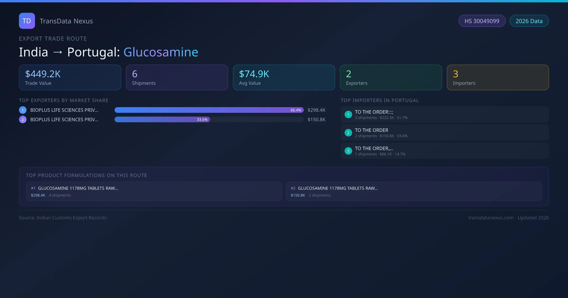 The India to Portugal Glucosamine corridor is one of India's established pharmaceutical export routes, with 6 shipments documented worth a combined $449.2K USD. The route is dominated by BIOPLUS LIFE SCIENCES PRIVATE LIMITED , which alone accounts for roughly 66% of all export value, reflecting the consolidated nature of India's glucosamine manufacturing sector.