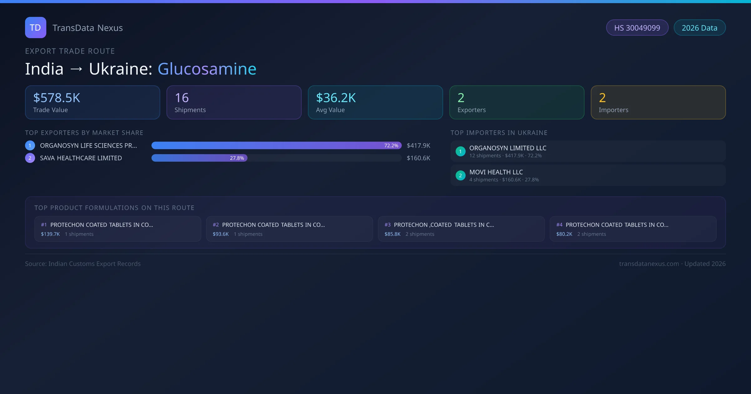 The India to Ukraine Glucosamine corridor is one of India's established pharmaceutical export routes, with 16 shipments documented worth a combined $578.5K USD. The route is dominated by ORGANOSYN LIFE SCIENCES PRIVATE LIMITED, which alone accounts for roughly 72% of all export value, reflecting the consolidated nature of India's glucosamine manufacturing sector.