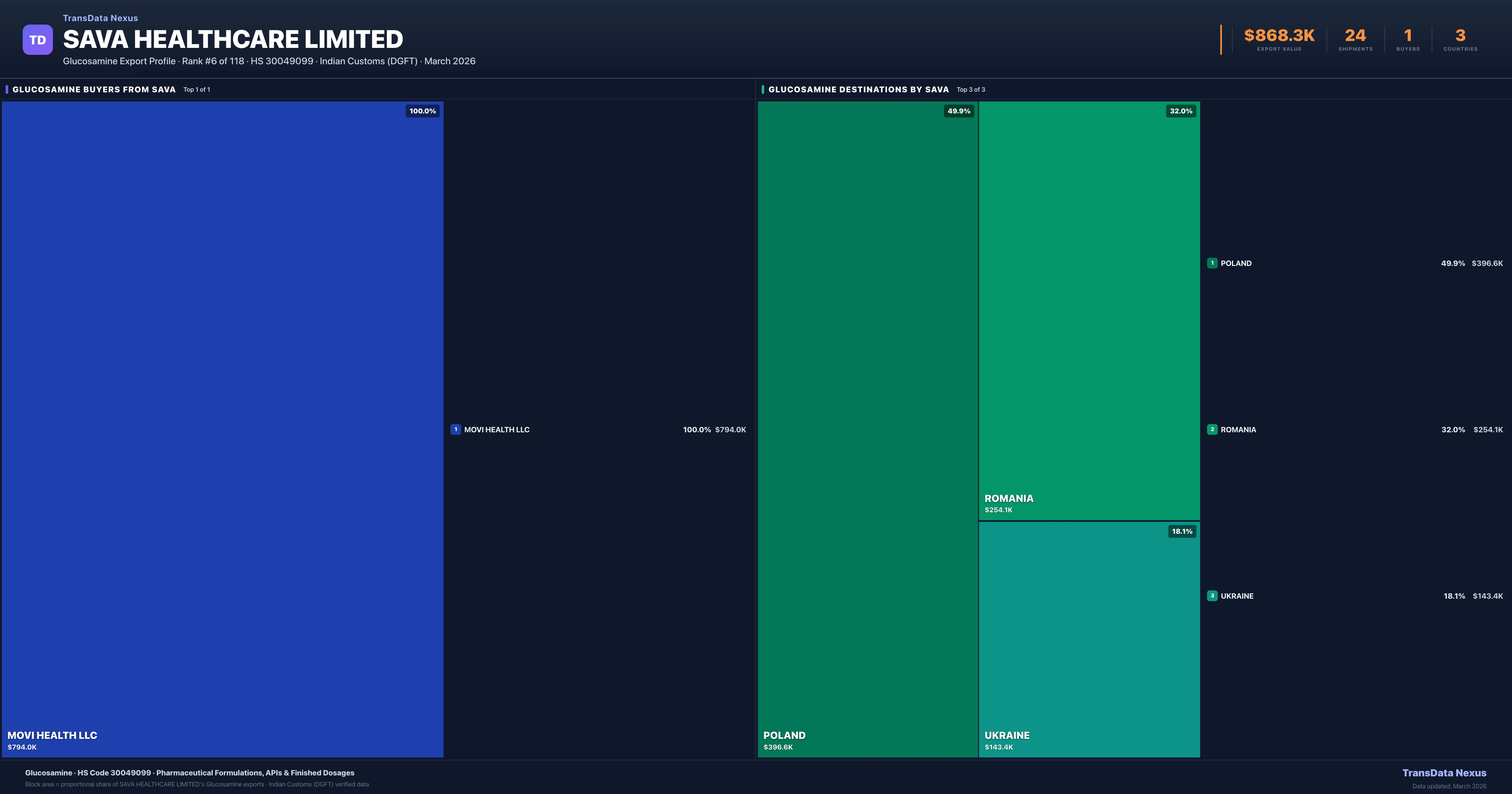Sava Healthcare Limited supplies Glucosamine to 1 buyers globally. The largest buyer is MOVI HEALTH LLC (POLAND). These buyers represent pharmaceutical distributors, hospital groups, and government procurement agencies in their respective markets.