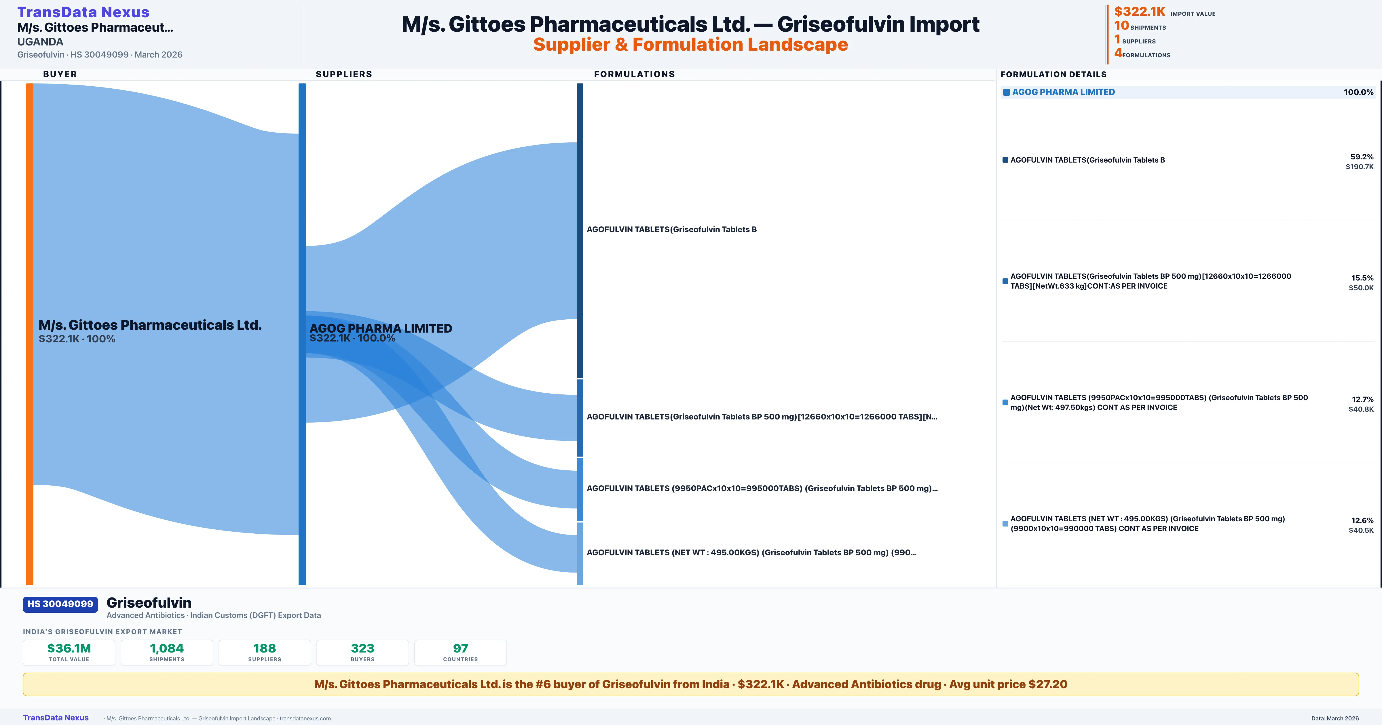 M/S. GITTOES PHARMACEUTICALS LTD. sources Griseofulvin from 1 verified Indian supplier: AGOG PHARMA LIMITED ($322.1K, 100.0%). This is based on 10 customs records.