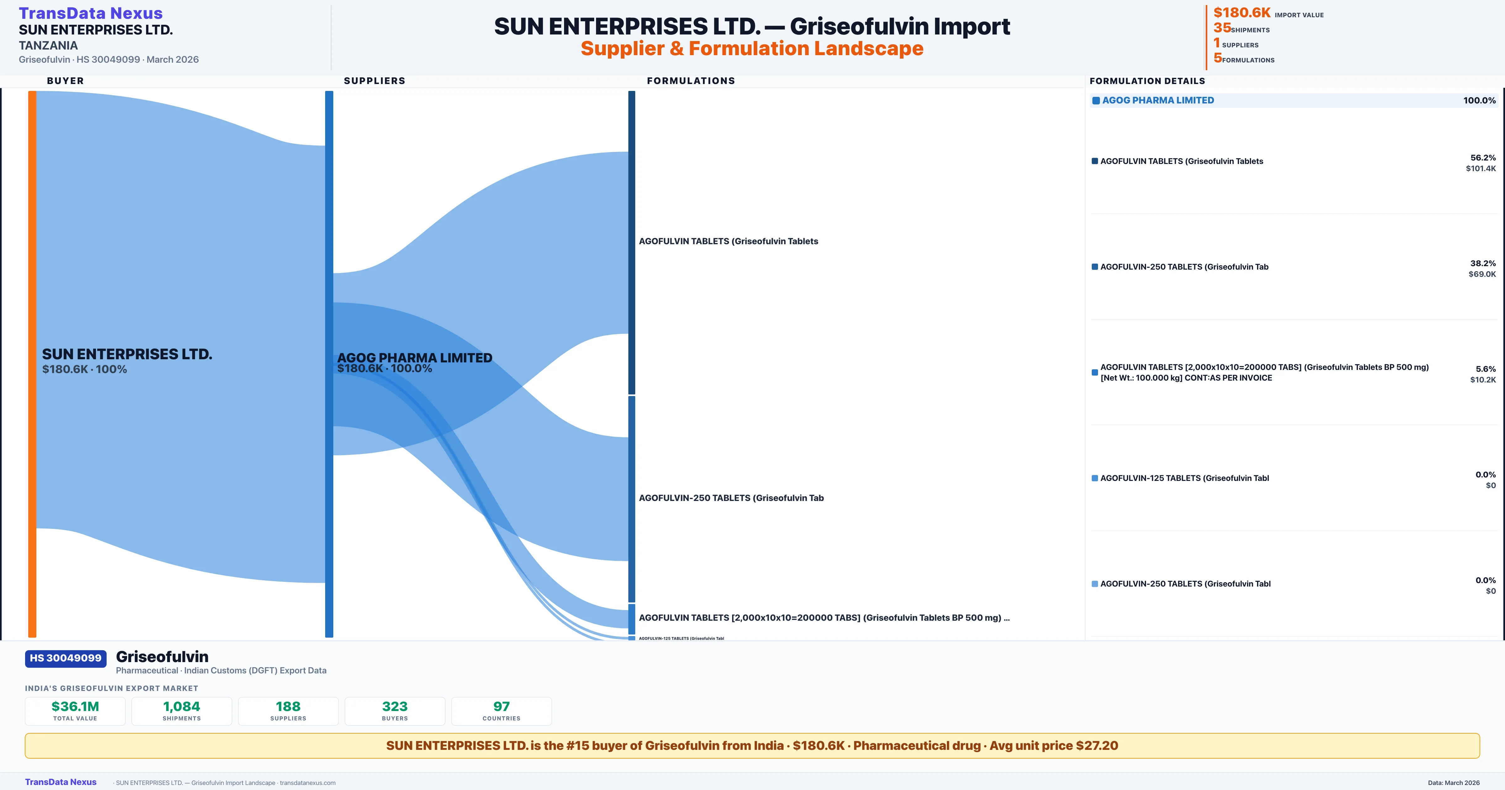 SUN ENTERPRISES LTD. sources Griseofulvin from 1 verified Indian supplier: AGOG PHARMA LIMITED ($180.6K, 100.0%). This is based on 35 customs records.
