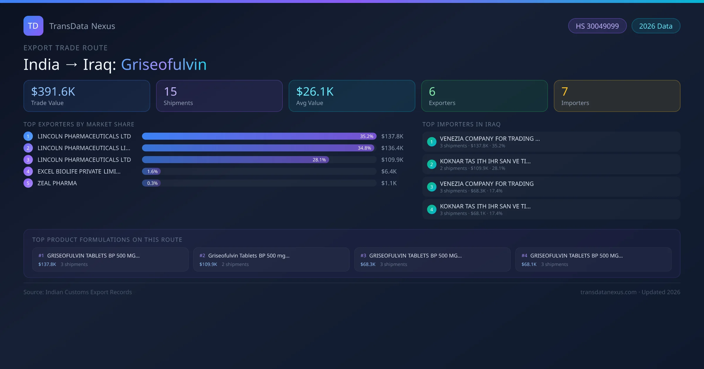 India has recorded 15 verified shipments of Griseofulvin exported to Iraq, representing a combined trade value of $391.6K USD. This corridor is served by 6 active Indian exporters, with an average shipment value of $26.1K USD. The leading Indian exporter is LINCOLN PHARMACEUTICALS LTD, which accounts for 35% of total export value with 3 shipments worth $137.8K USD. On the buying side, VENEZIA COMPANY FOR TRADING SHIPPIN is the largest importer in Iraq with $137.8K USD in purchases. The top 3 suppliers — LINCOLN PHARMACEUTICALS LTD, LINCOLN PHARMACEUTICALS LIMITED, LINCOLN PHARMACEUTICALS LTD — together control 98% of total trade value on this route. All data sourced from Indian Customs (DGFT) shipping bill records. Values reported in FOB USD.