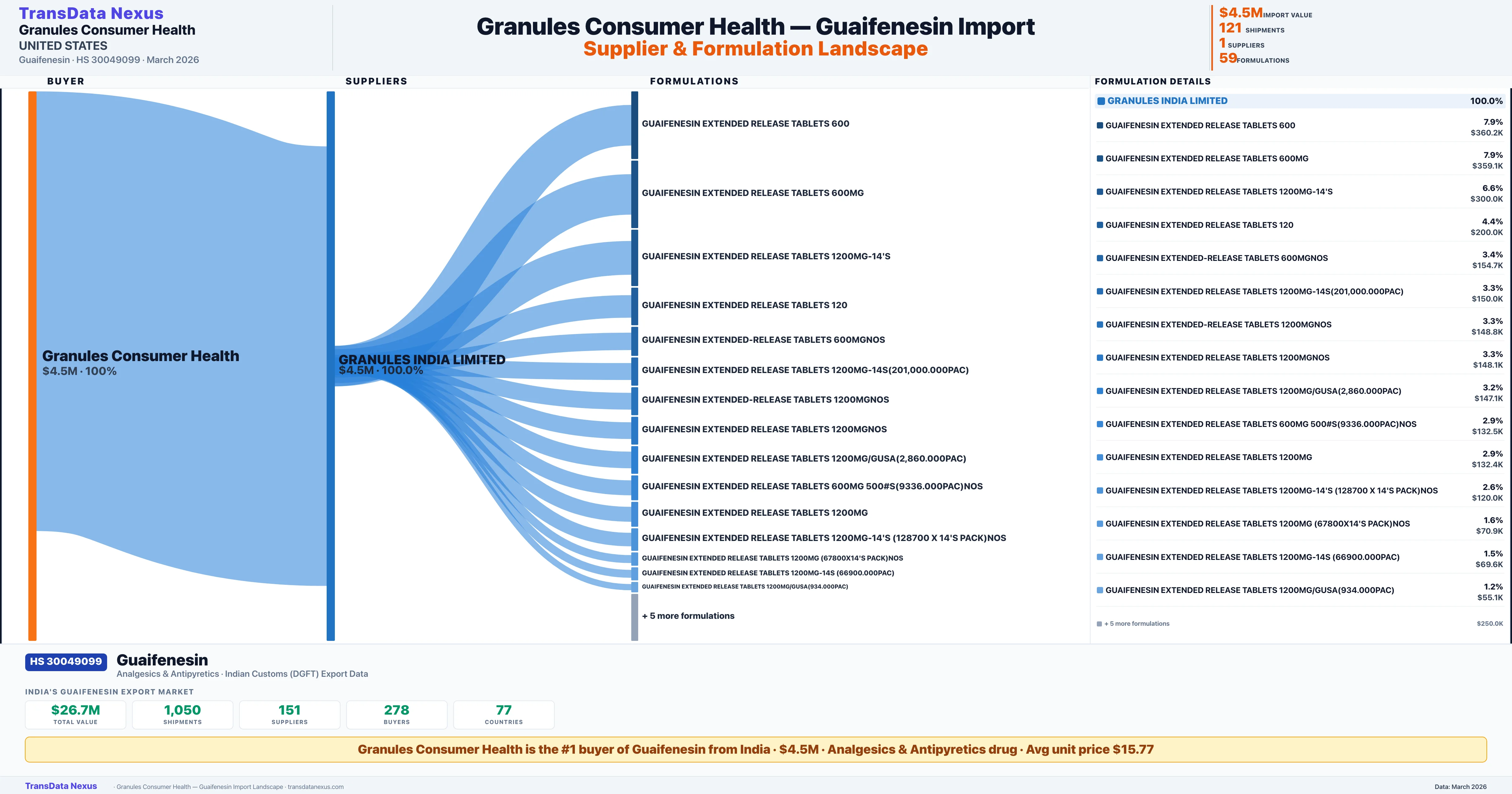 GRANULES CONSUMER HEALTH sources Guaifenesin from 1 verified Indian supplier: GRANULES INDIA LIMITED ($4.5M, 100.0%). This is based on 121 customs records.