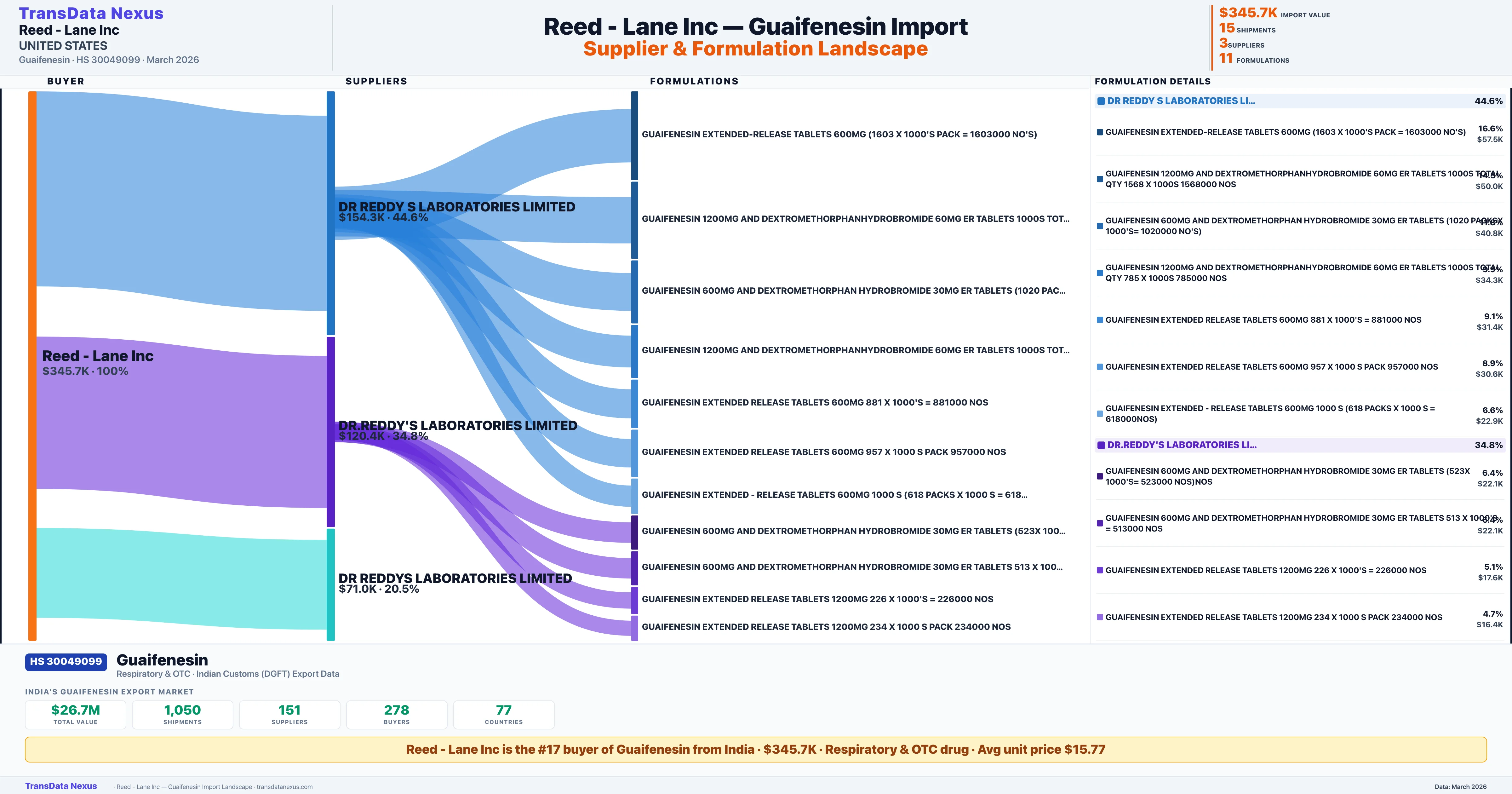 REED LANE INC sources Guaifenesin from 3 verified Indian suppliers: DR REDDY S LABORATORIES LIMITED ($154.3K, 44.6%), DR.REDDY'S LABORATORIES LIMITED ($120.4K, 34.8%), DR REDDYS LABORATORIES LIMITED ($71.0K, 20.5%). This is based on 15 customs records.
