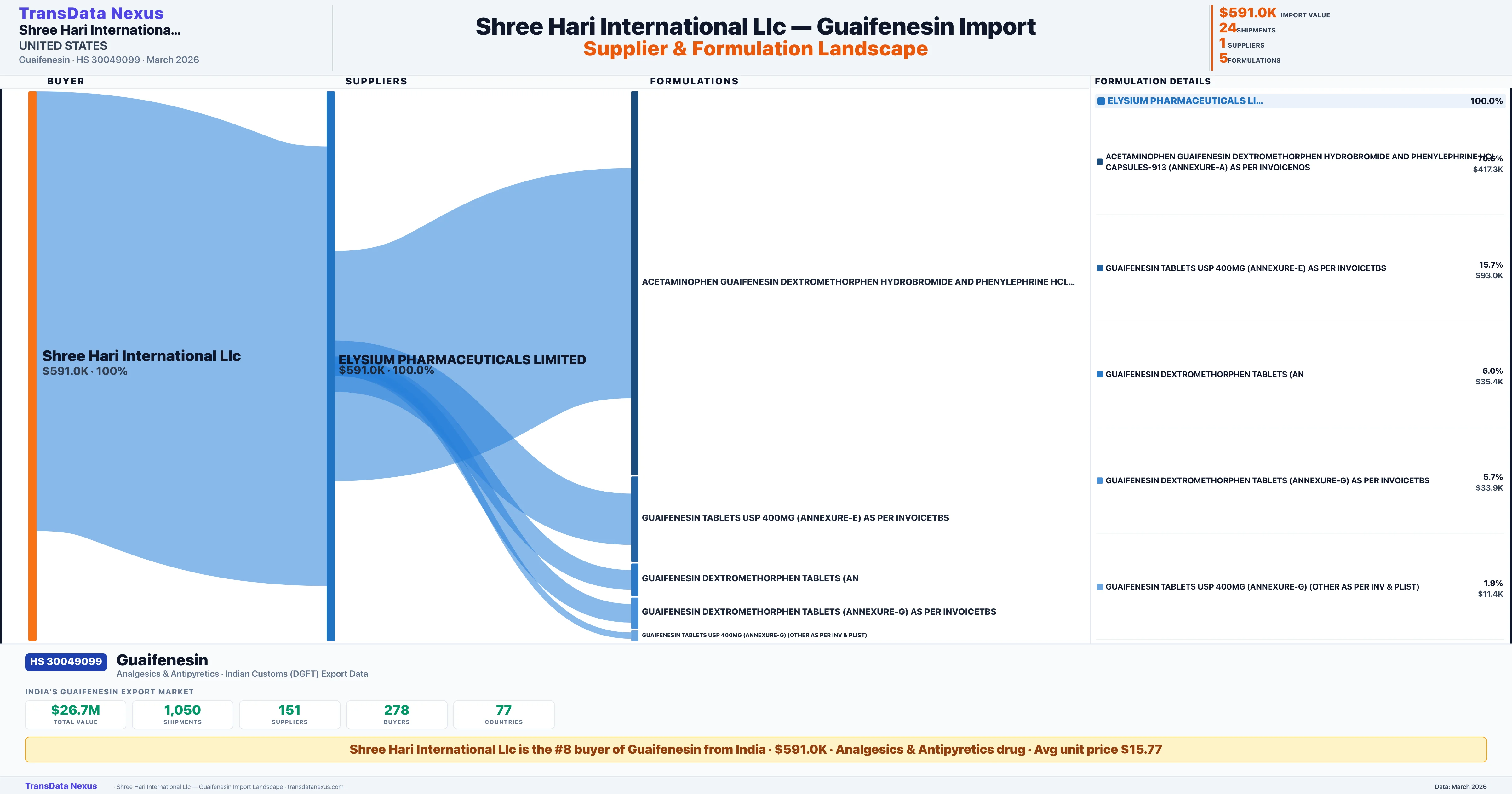 SHREE HARI INTERNATIONAL LLC sources Guaifenesin from 1 verified Indian supplier: ELYSIUM PHARMACEUTICALS LIMITED ($591.0K, 100.0%). This is based on 24 customs records.