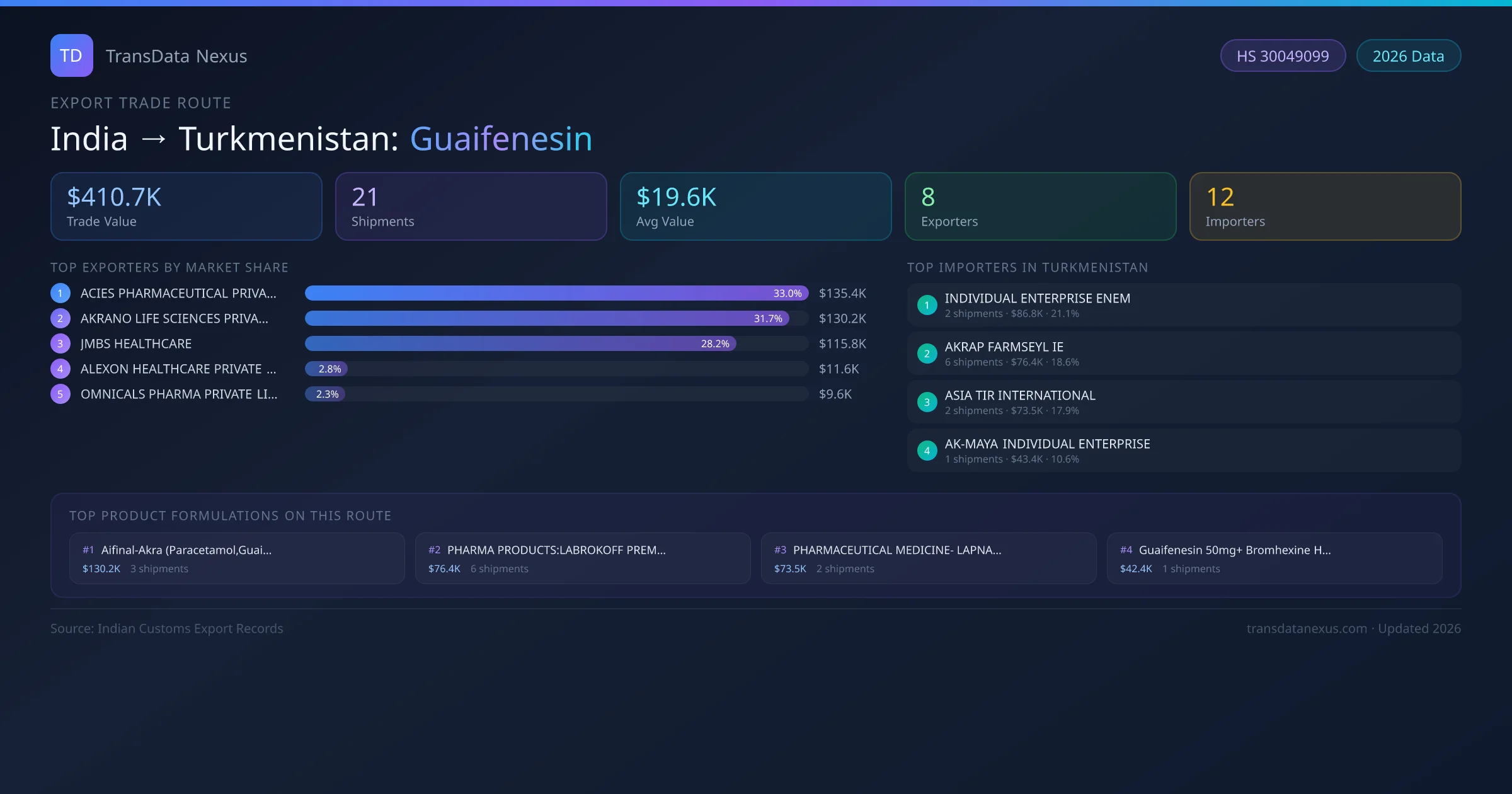 - 1.Route Identification: India to Turkmenistan export trade corridor identified from Indian Customs (DGFT) records for Guaifenesin.