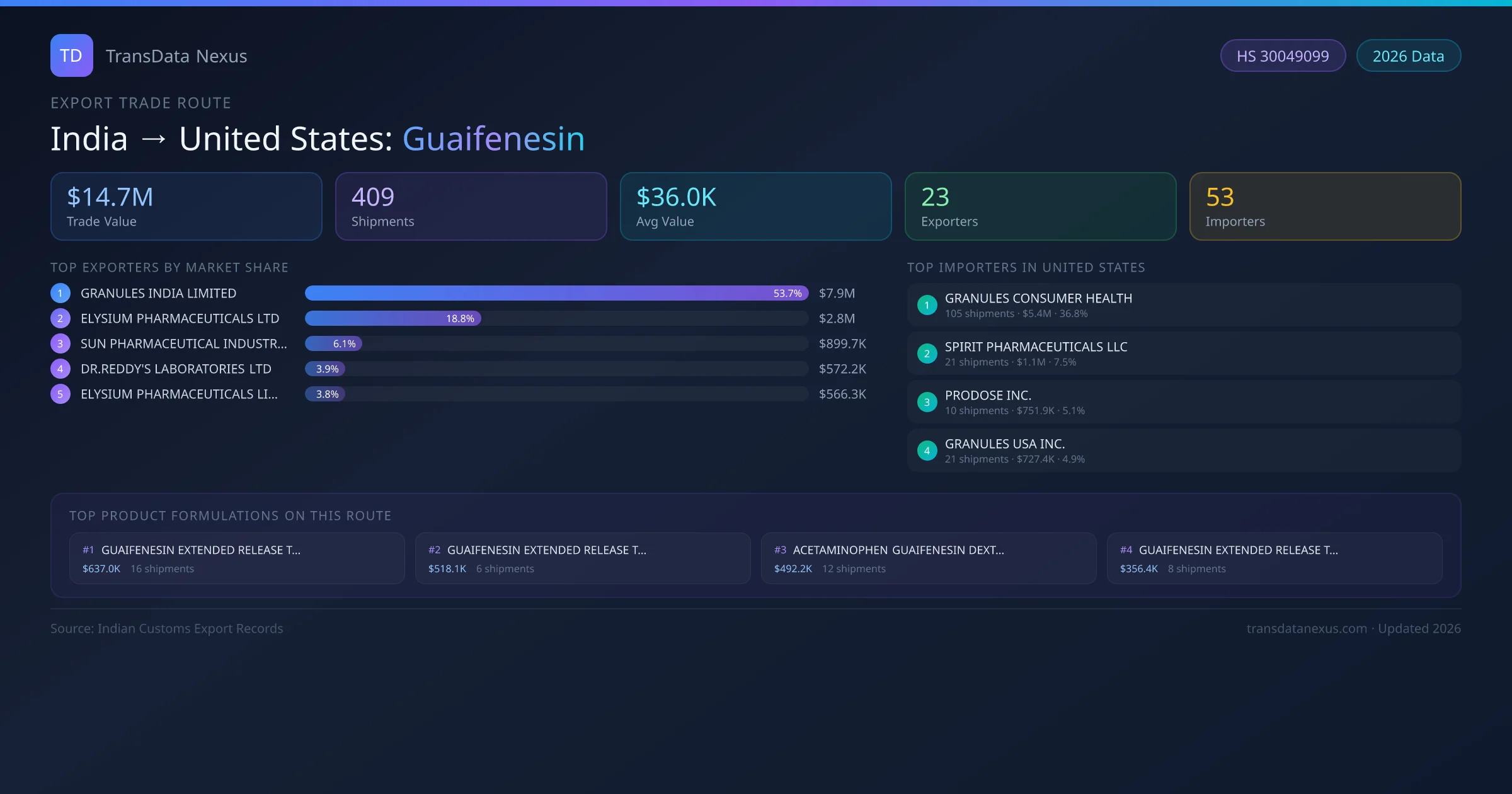 The India to United States Guaifenesin corridor is one of India's established pharmaceutical export routes, with 409 shipments documented worth a combined $14.7M USD. The route is dominated by GRANULES INDIA LIMITED, which alone accounts for roughly 54% of all export value, reflecting the consolidated nature of India's guaifenesin manufacturing sector.