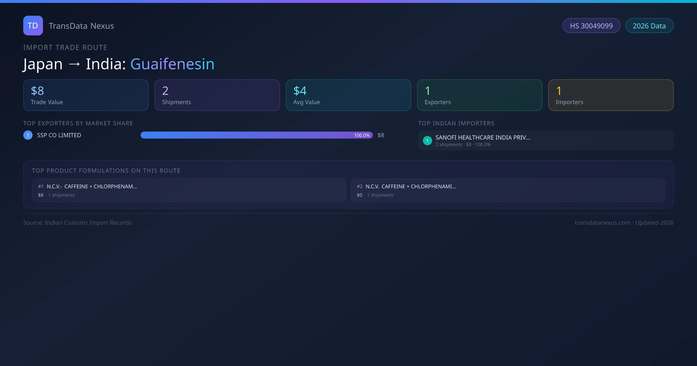 The Japan to India Guaifenesin corridor is one of India's established pharmaceutical import routes from Japan, with 2 shipments documented worth a combined $8 USD. The route is dominated by SSP CO LIMITED, which alone accounts for roughly 100% of all import value, reflecting the consolidated nature of Japan's guaifenesin export sector.