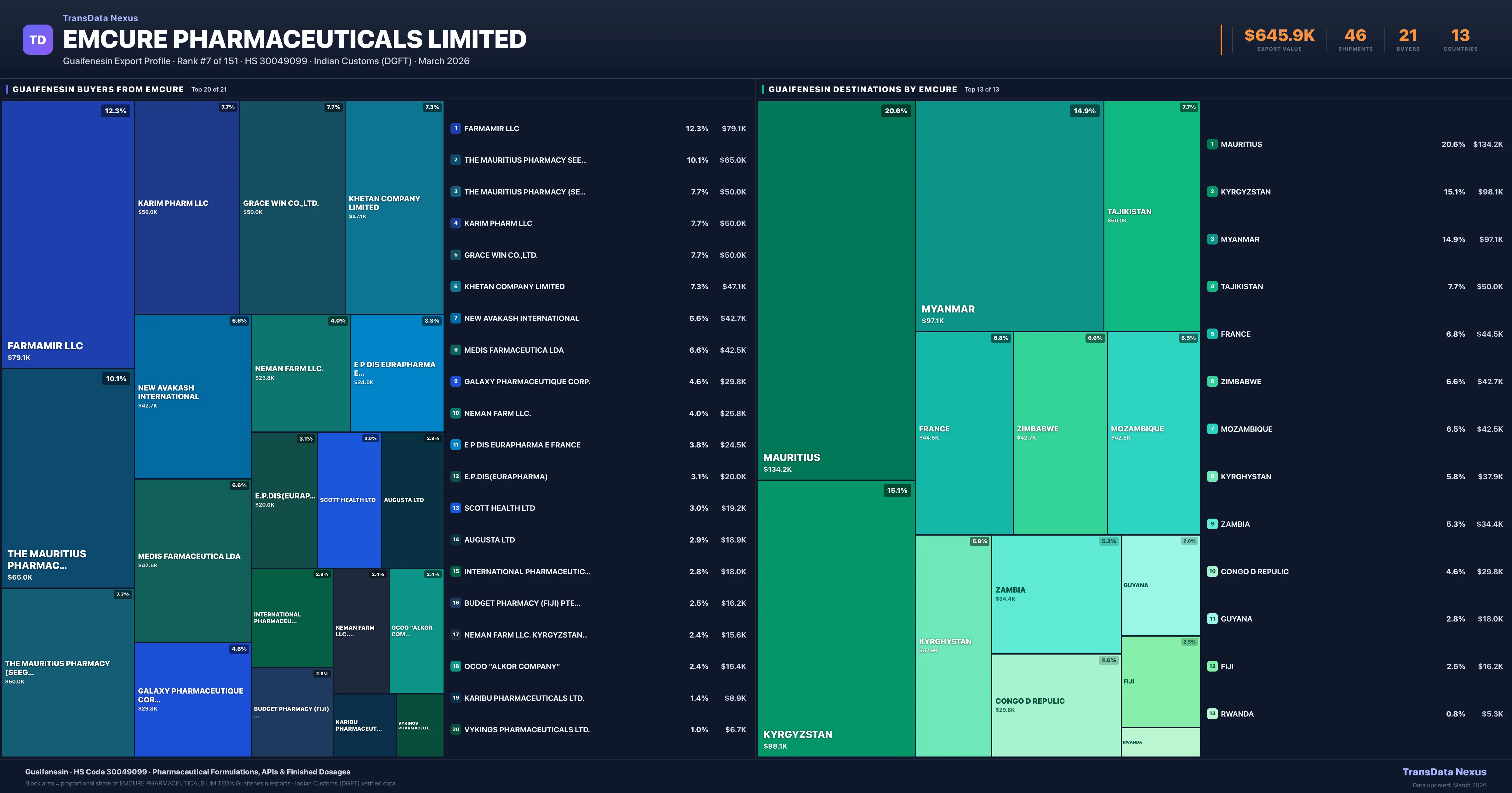 Emcure Pharmaceuticals Limited — Guaifenesin Export Profile: Buyers & Destinations