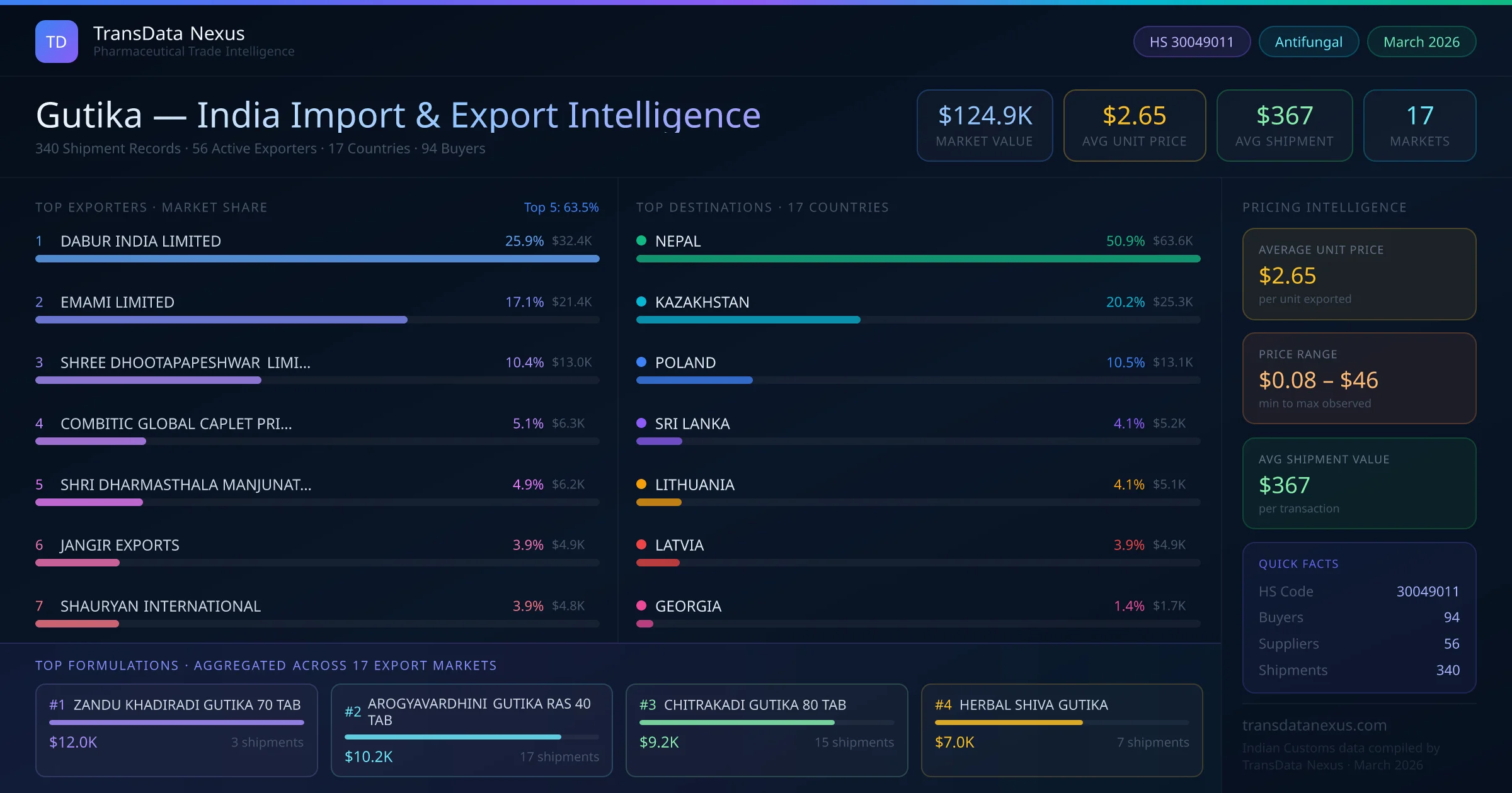 Between 2022 and 2026, India exported $124.9K worth of gutika across 340 verified shipments to 17 countries — covering 9% of world markets in the Ayurvedic & Herbal Products segment. The largest destination is NEPAL (50.9%). DABUR INDIA LIMITED leads with a 25.9% share. All figures are drawn from Indian Customs (DGFT) shipping bill records spanning four years of trade activity.