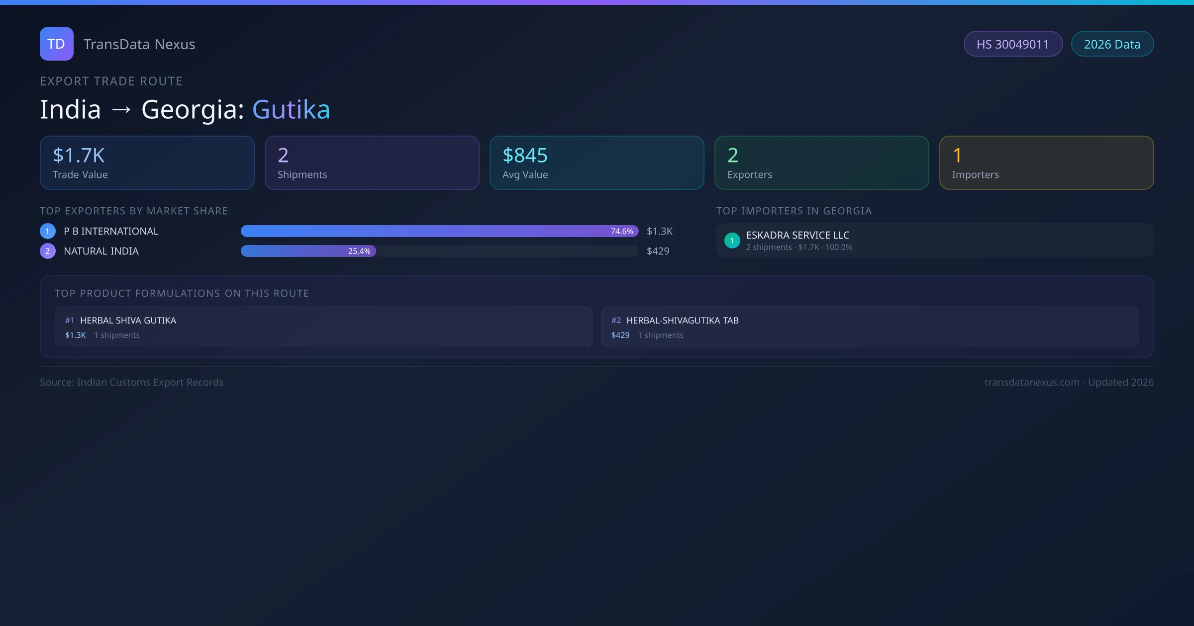 The India to Georgia Gutika corridor is one of India's established pharmaceutical export routes, with 2 shipments documented worth a combined $1.7K USD. The route is dominated by P B INTERNATIONAL, which alone accounts for roughly 75% of all export value, reflecting the consolidated nature of India's gutika manufacturing sector.