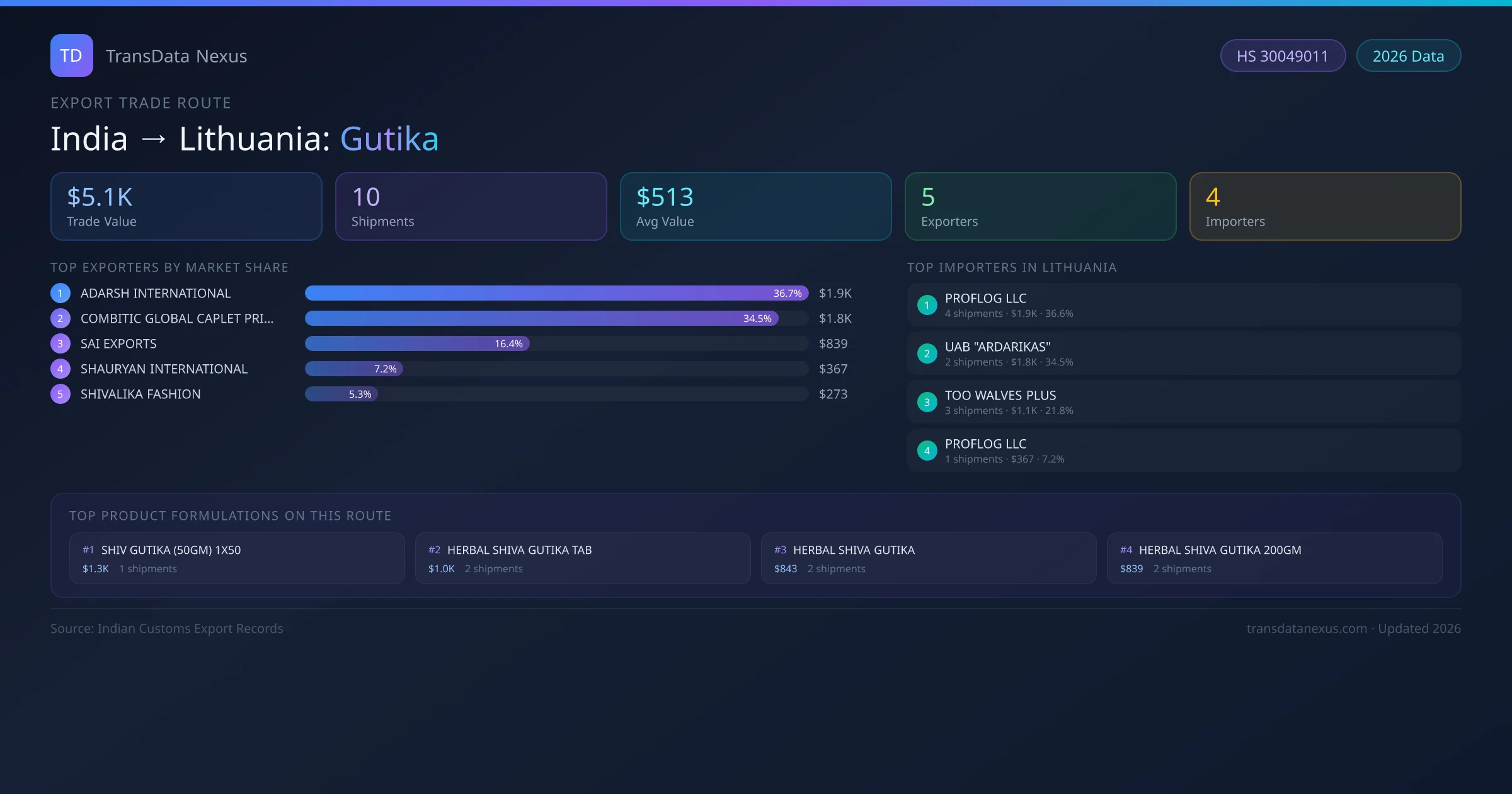 The India to Lithuania Gutika corridor is one of India's established pharmaceutical export routes, with 10 shipments documented worth a combined $5.1K USD. The route is dominated by ADARSH INTERNATIONAL , which alone accounts for roughly 37% of all export value, reflecting the consolidated nature of India's gutika manufacturing sector.