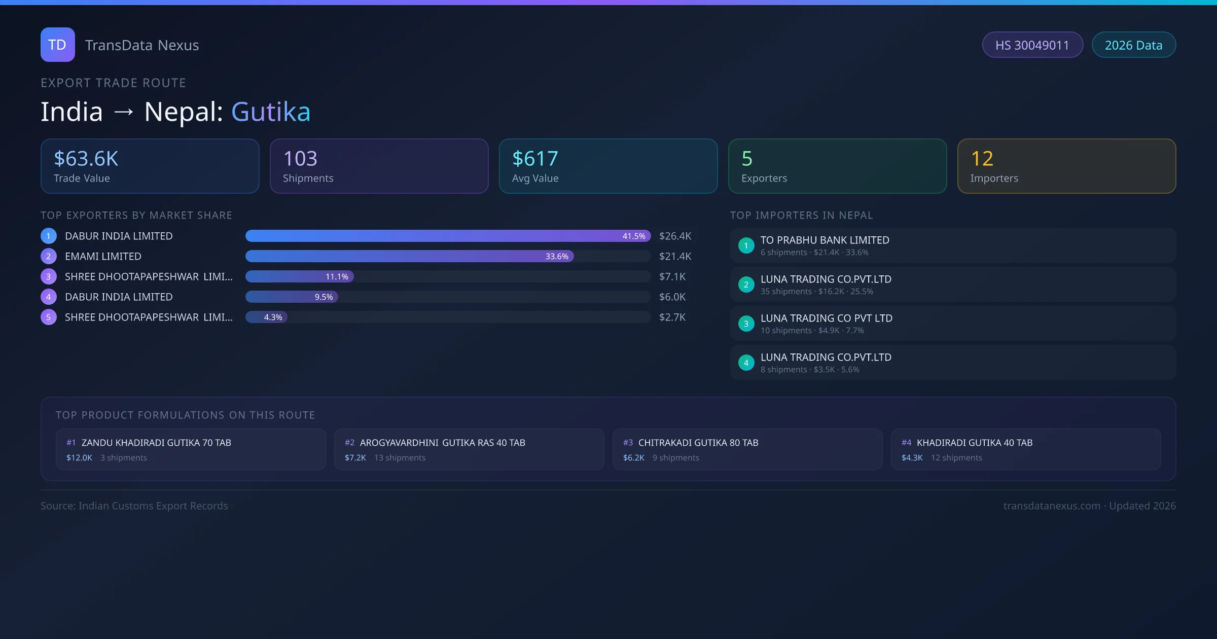 The India to Nepal Gutika corridor is one of India's established pharmaceutical export routes, with 103 shipments documented worth a combined $63.6K USD. The route is dominated by DABUR INDIA LIMITED, which alone accounts for roughly 41% of all export value, reflecting the consolidated nature of India's gutika manufacturing sector.