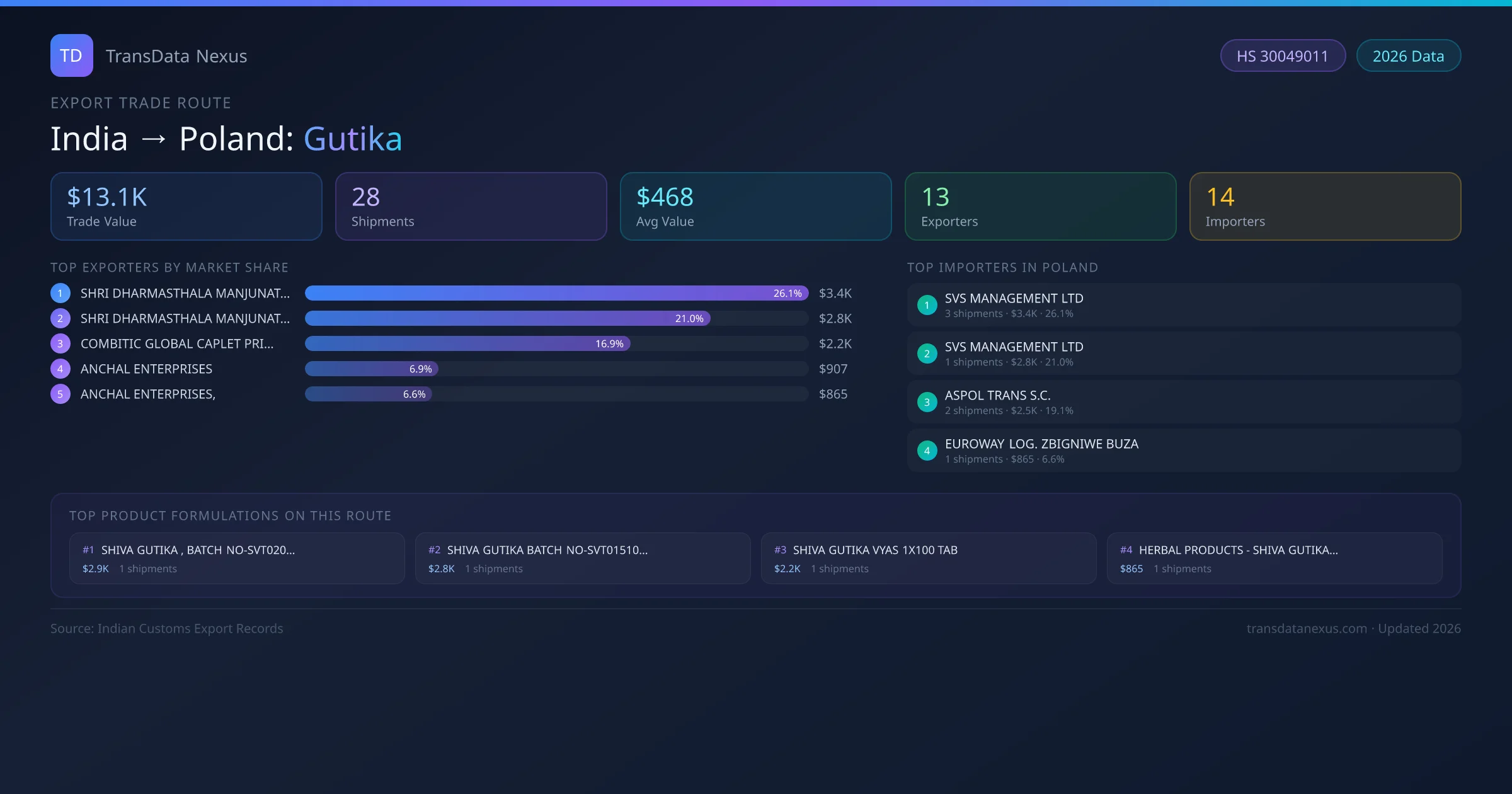 The India to Poland Gutika corridor is one of India's established pharmaceutical export routes, with 28 shipments documented worth a combined $13.1K USD. The route is dominated by SHRI DHARMASTHALA MANJUNATHESHWARA BAISHAJYA PRATI, which alone accounts for roughly 26% of all export value, reflecting the consolidated nature of India's gutika manufacturing sector.