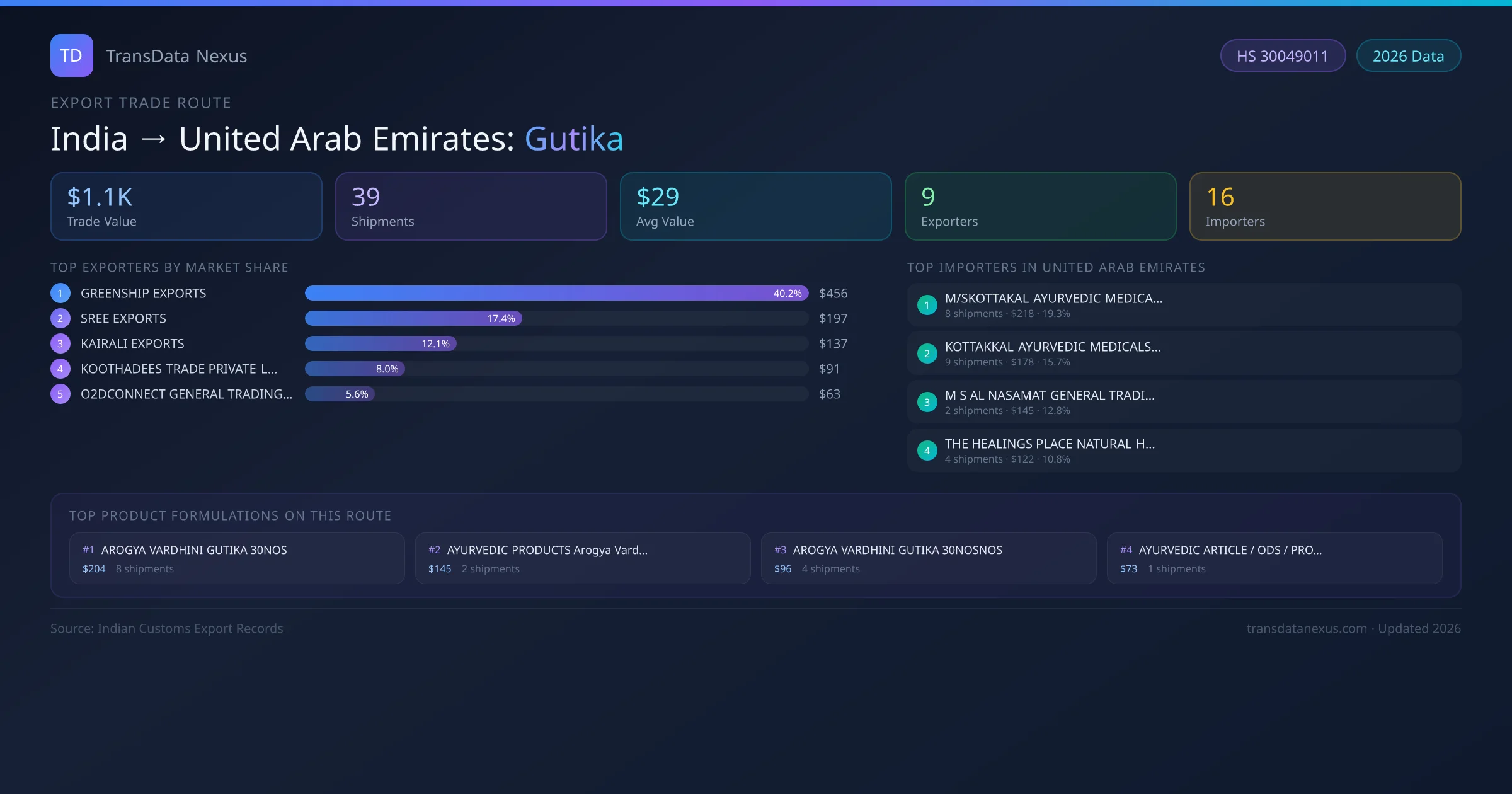India has recorded 39 verified shipments of Gutika exported to United Arab Emirates, representing a combined trade value of $1.1K USD. This corridor is served by 9 active Indian exporters, with an average shipment value of $29 USD. The leading Indian exporter is GREENSHIP EXPORTS, which accounts for 40% of total export value with 20 shipments worth $456 USD. On the buying side, M/SKOTTAKAL AYURVEDIC MEDICALS LLC is the largest importer in United Arab Emirates with $218 USD in purchases. The top 3 suppliers — GREENSHIP EXPORTS, SREE EXPORTS, KAIRALI EXPORTS — together control 70% of total trade value on this route. All data sourced from Indian Customs (DGFT) shipping bill records. Values reported in FOB USD.