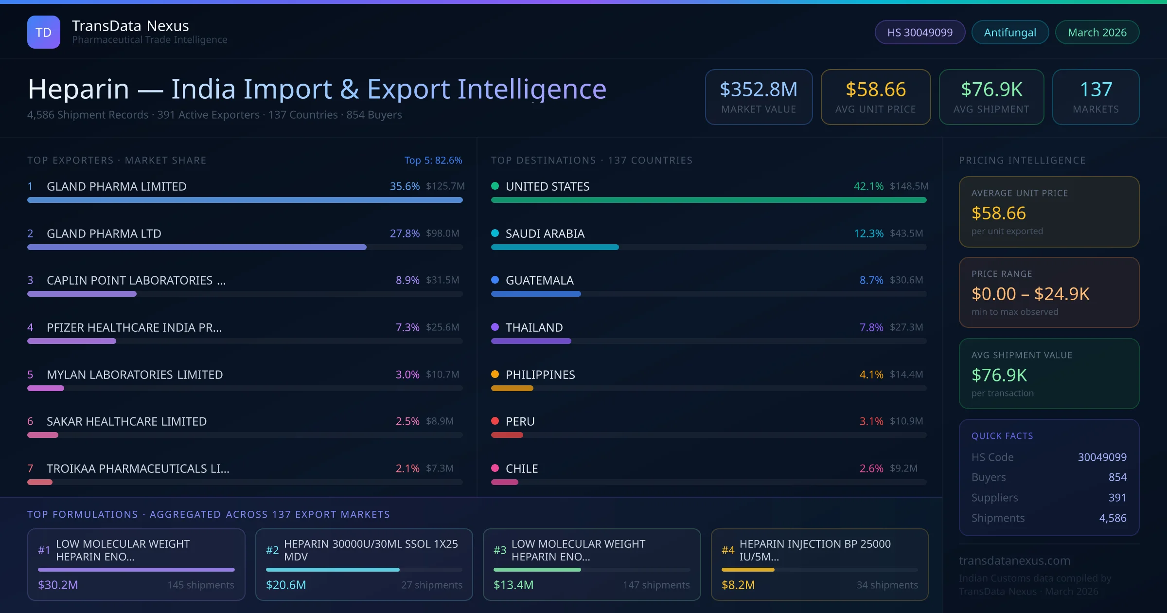 Between 2022 and 2026, India exported $352.8M worth of heparin across 4,586 verified shipments to 137 countries — covering 70% of world markets in the Cardiovascular segment. The largest destination is UNITED STATES (42.1%). GLAND PHARMA LIMITED leads with a 35.6% share. All figures are drawn from Indian Customs (DGFT) shipping bill records spanning four years of trade activity.