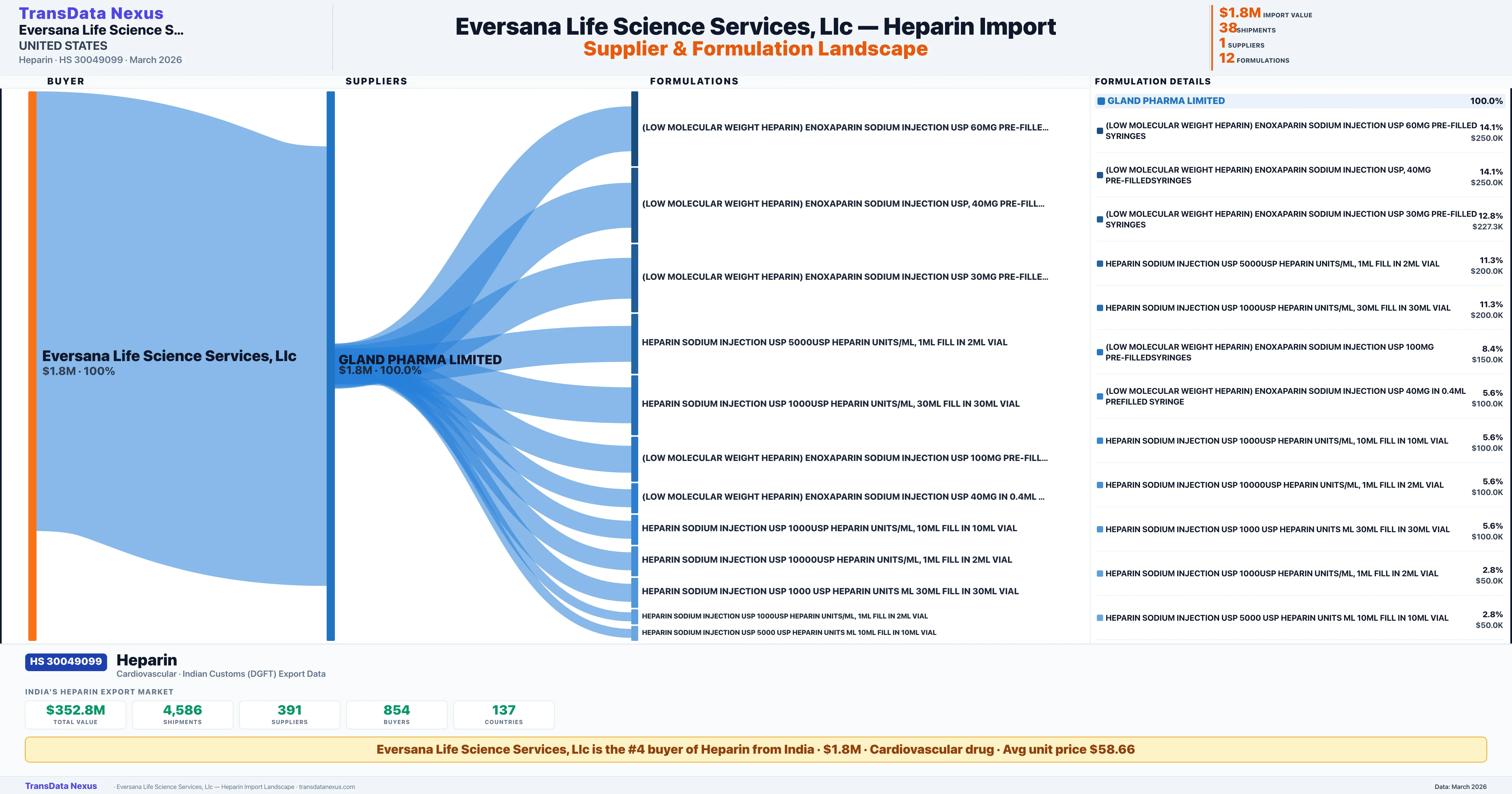 EVERSANA LIFE SCIENCE SERVICES LLC sources Heparin from 1 verified Indian supplier: GLAND PHARMA LIMITED ($1.8M, 100.0%). This is based on 38 customs records.