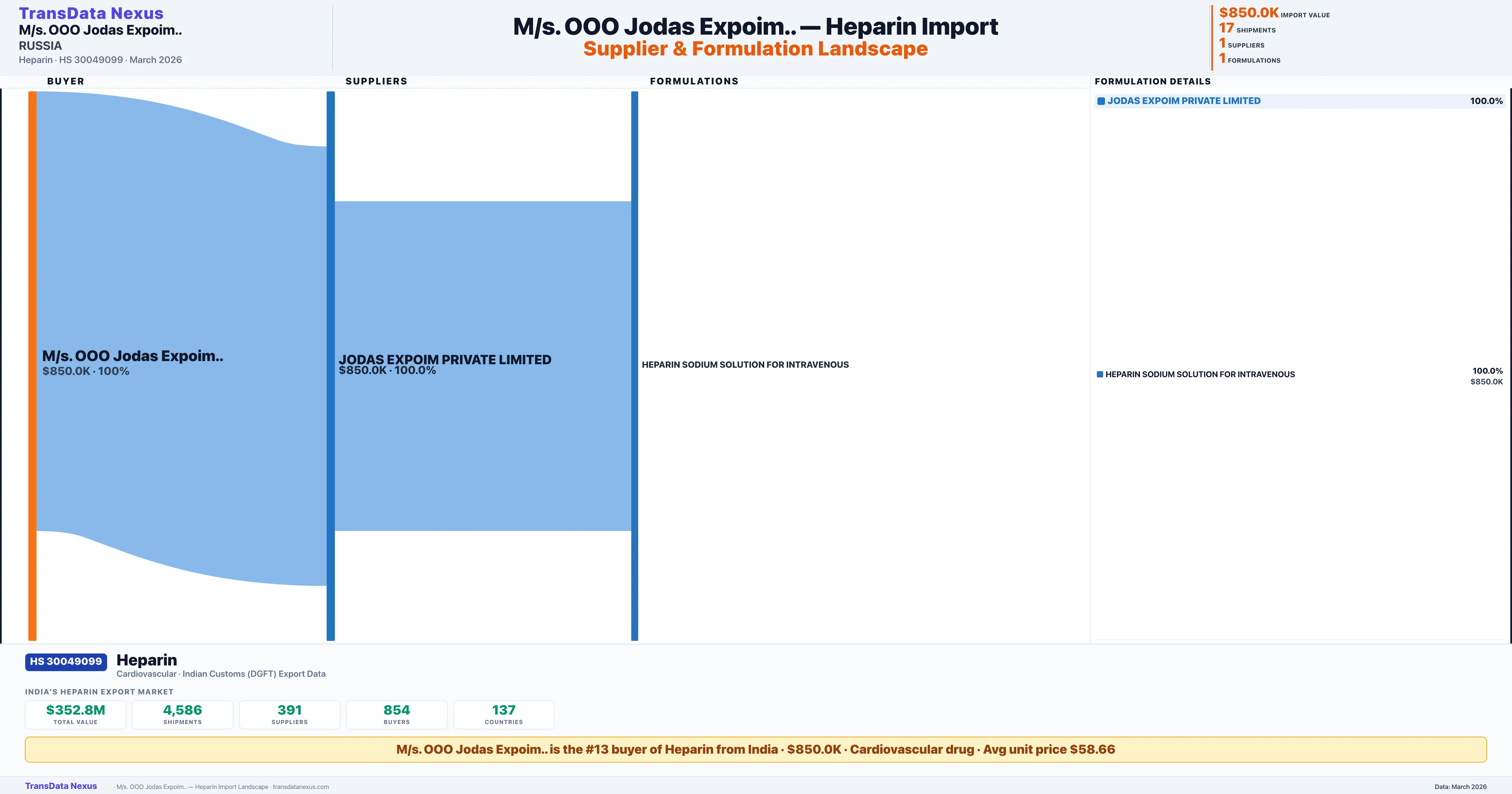 M/S. OOO JODAS EXPOIM.. sources Heparin from 1 verified Indian supplier: JODAS EXPOIM PRIVATE LIMITED ($850.0K, 100.0%). This is based on 17 customs records.