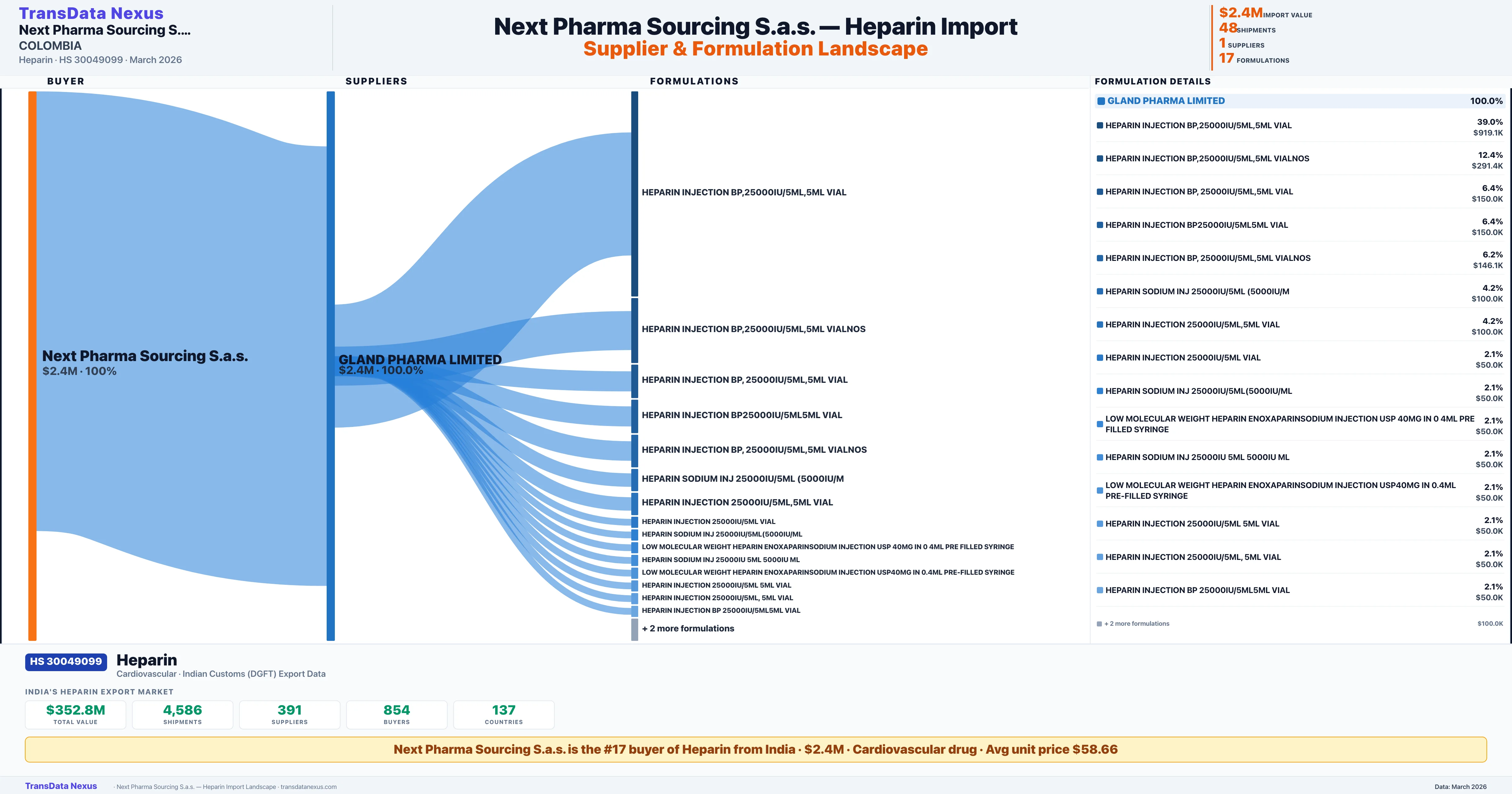 NEXT PHARMA SOURCING S.A.S sources Heparin from 1 verified Indian supplier: GLAND PHARMA LIMITED ($2.4M, 100.0%). This is based on 48 customs records.