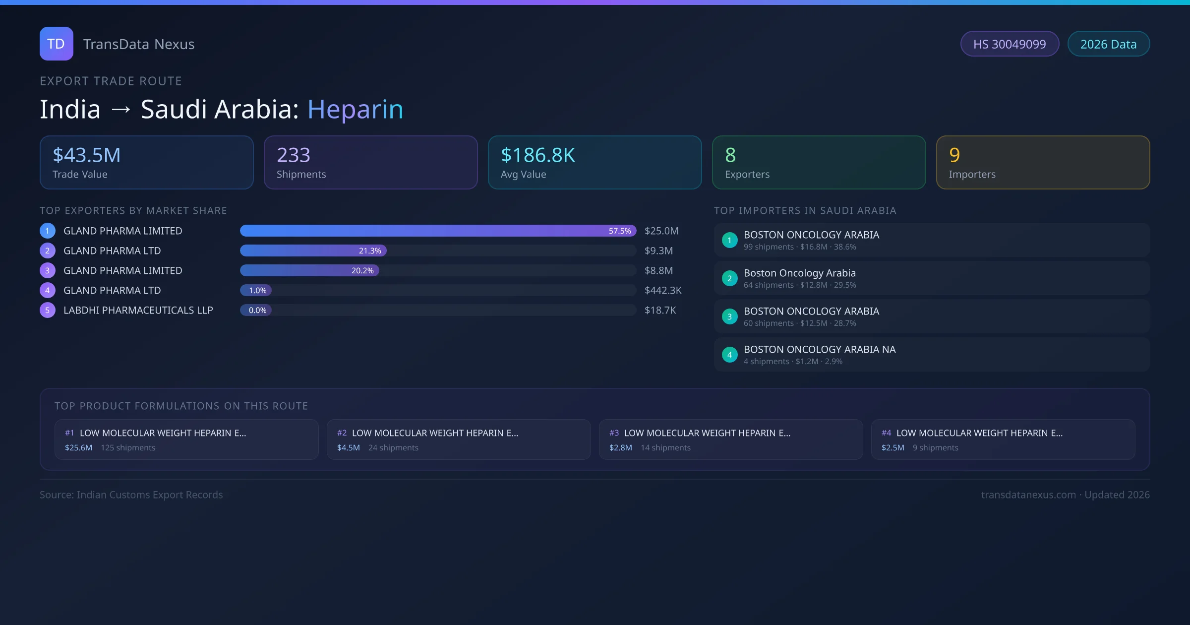 India has recorded 233 verified shipments of Heparin exported to Saudi Arabia, representing a combined trade value of $43.5M USD. This corridor is served by 8 active Indian exporters, with an average shipment value of $186.8K USD. The leading Indian exporter is GLAND PHARMA LIMITED , which accounts for 57% of total export value with 124 shipments worth $25.0M USD. On the buying side, BOSTON ONCOLOGY ARABIA is the largest importer in Saudi Arabia with $16.8M USD in purchases. The top 3 suppliers — GLAND PHARMA LIMITED , GLAND PHARMA LTD, GLAND PHARMA LIMITED — together control 99% of total trade value on this route. All data sourced from Indian Customs (DGFT) shipping bill records. Values reported in FOB USD.