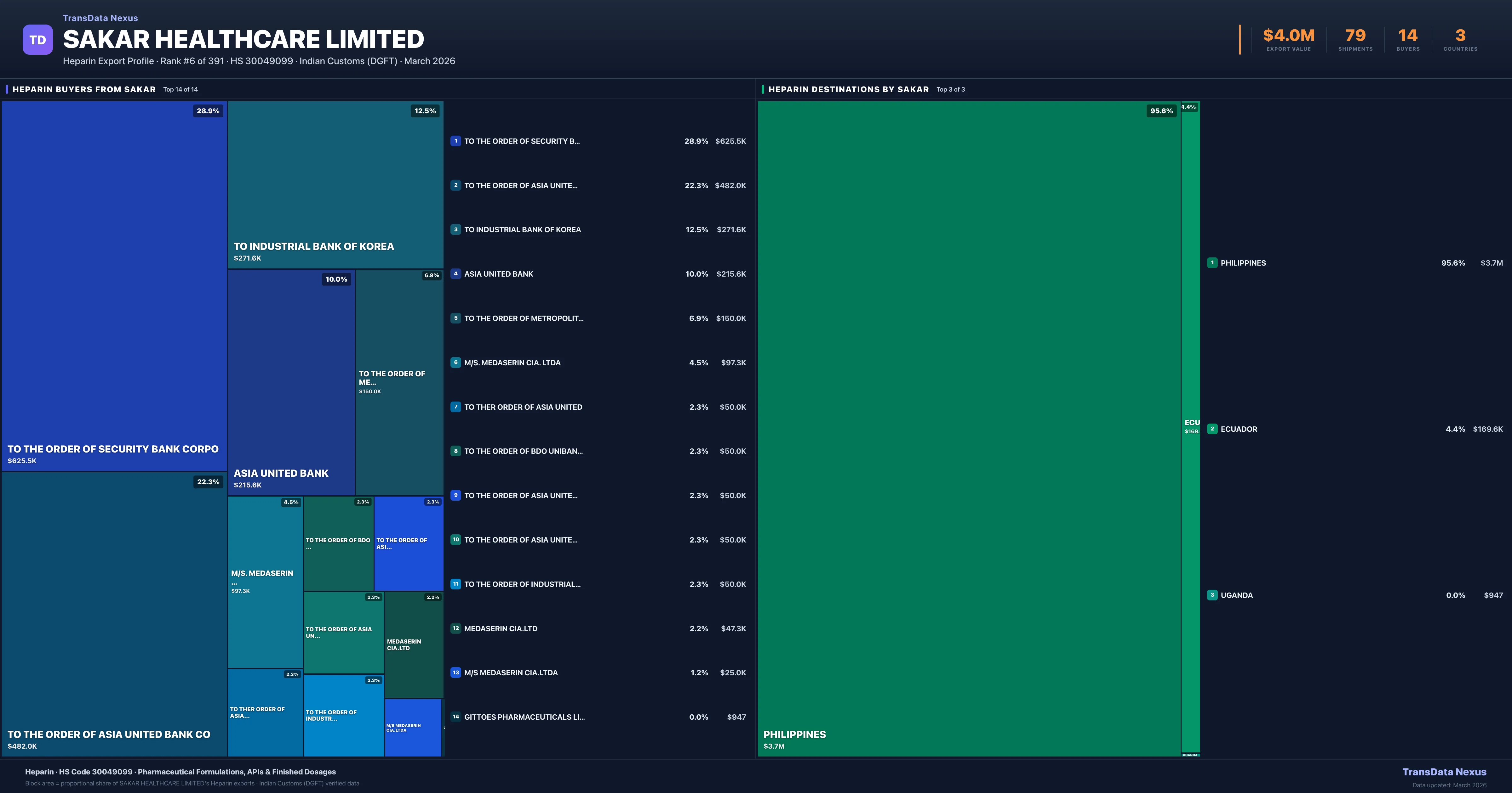 Sakar Healthcare Limited supplies Heparin to 14 buyers globally. The largest buyer is TO THE ORDER OF SECURITY BANK CORPO (PHILIPPINES), followed by TO THE ORDER OF ASIA UNITED BANK CO (PHILIPPINES) and TO INDUSTRIAL BANK OF KOREA (PHILIPPINES). These buyers represent pharmaceutical distributors, hospital groups, and government procurement agencies in their respective markets.