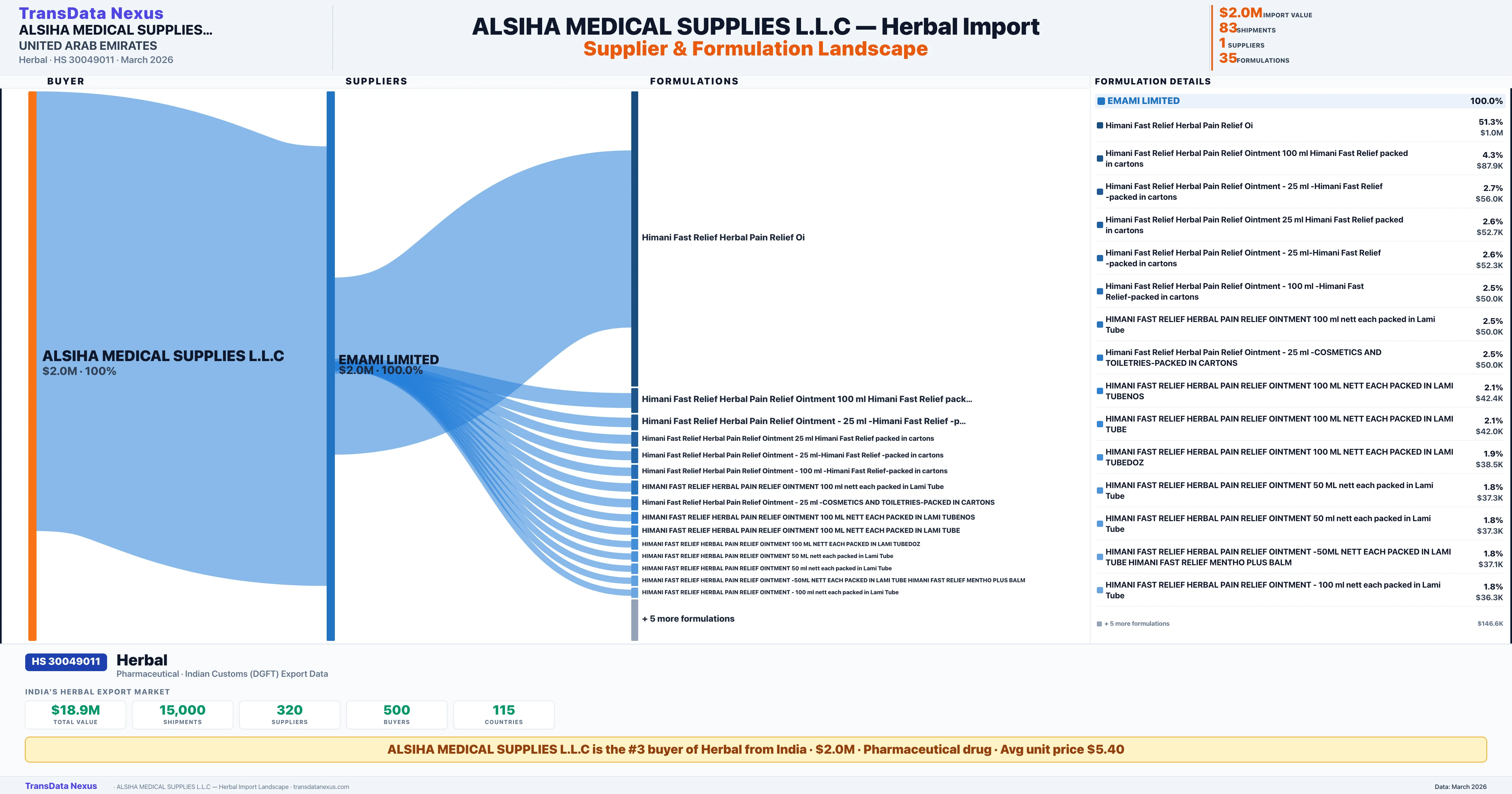 ALSIHA MEDICAL SUPPLIES L.L.C is the #3 importer of Herbal from India with $2.0M in import value and 83 verified shipments. ALSIHA MEDICAL SUPPLIES L.L.C holds a 4.2% market share in Herbal imports based in UNITED ARAB EMIRATES. The company sources from 1 verified supplier across 35 formulations shipped to 1 country.