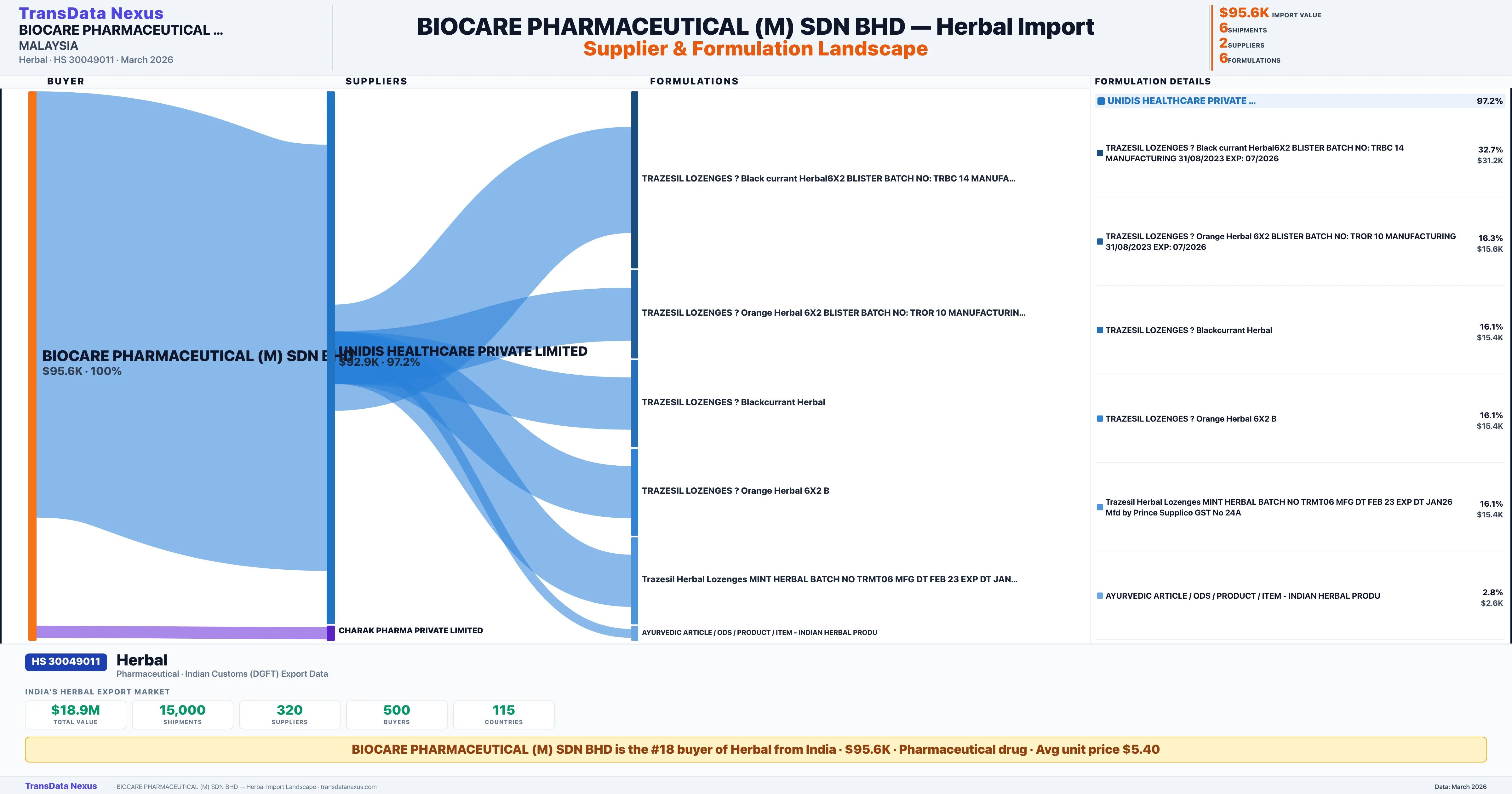Access order-level details, pricing data, supplier connections, and competitive analysis for BIOCARE PHARMACEUTICAL (M) SDN BHD's Herbal imports. TransData Nexus provides verified Indian Customs (DGFT) data trusted by pharmaceutical trade professionals worldwide.