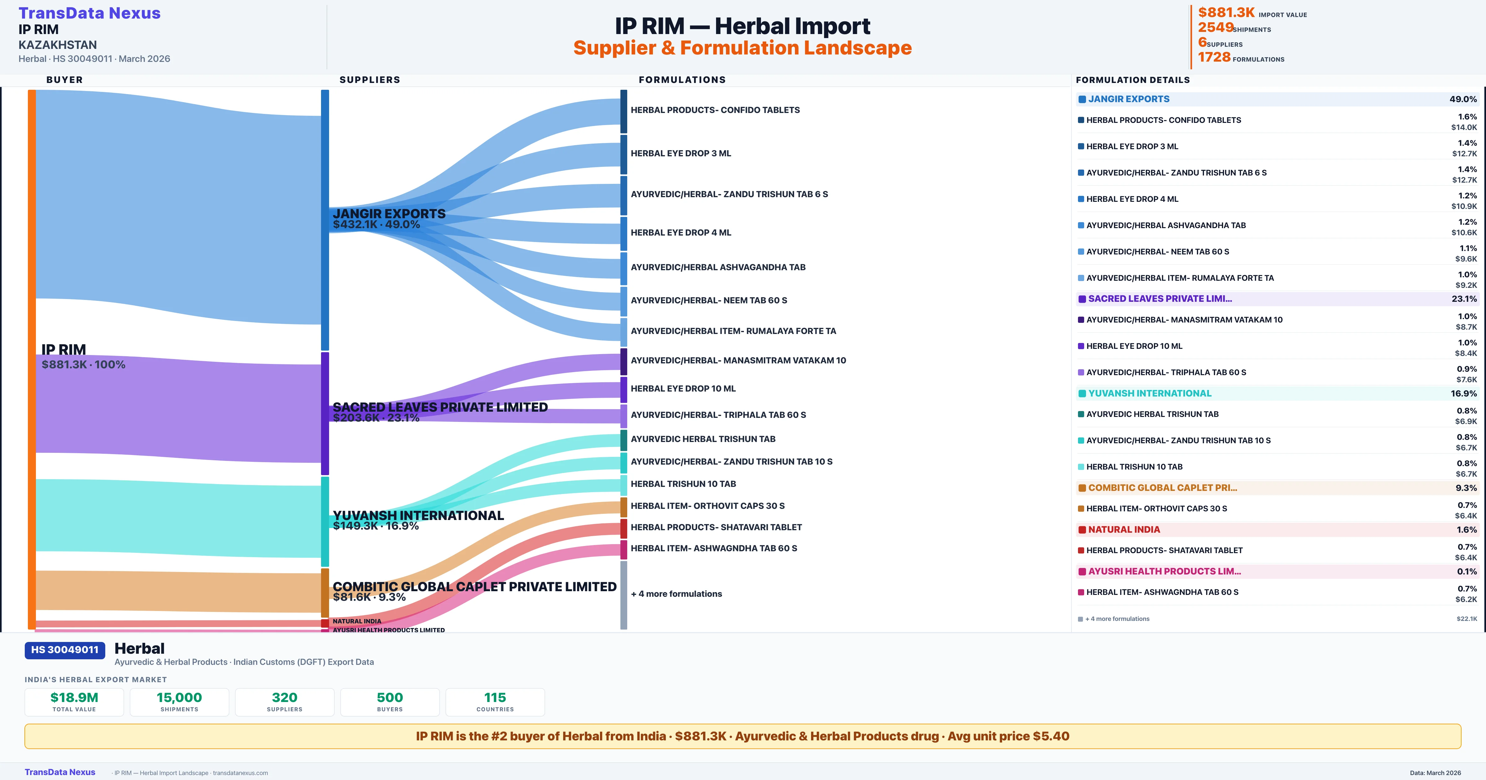IP RIM sources Herbal from 6 verified Indian suppliers: JANGIR EXPORTS ($432.1K, 49.0%), SACRED LEAVES PRIVATE LIMITED ($203.6K, 23.1%), YUVANSH INTERNATIONAL ($149.3K, 16.9%), COMBITIC GLOBAL CAPLET PRIVATE LIMITED ($81.6K, 9.3%), NATURAL INDIA ($14.1K, 1.6%). This is based on 2,549 customs records.