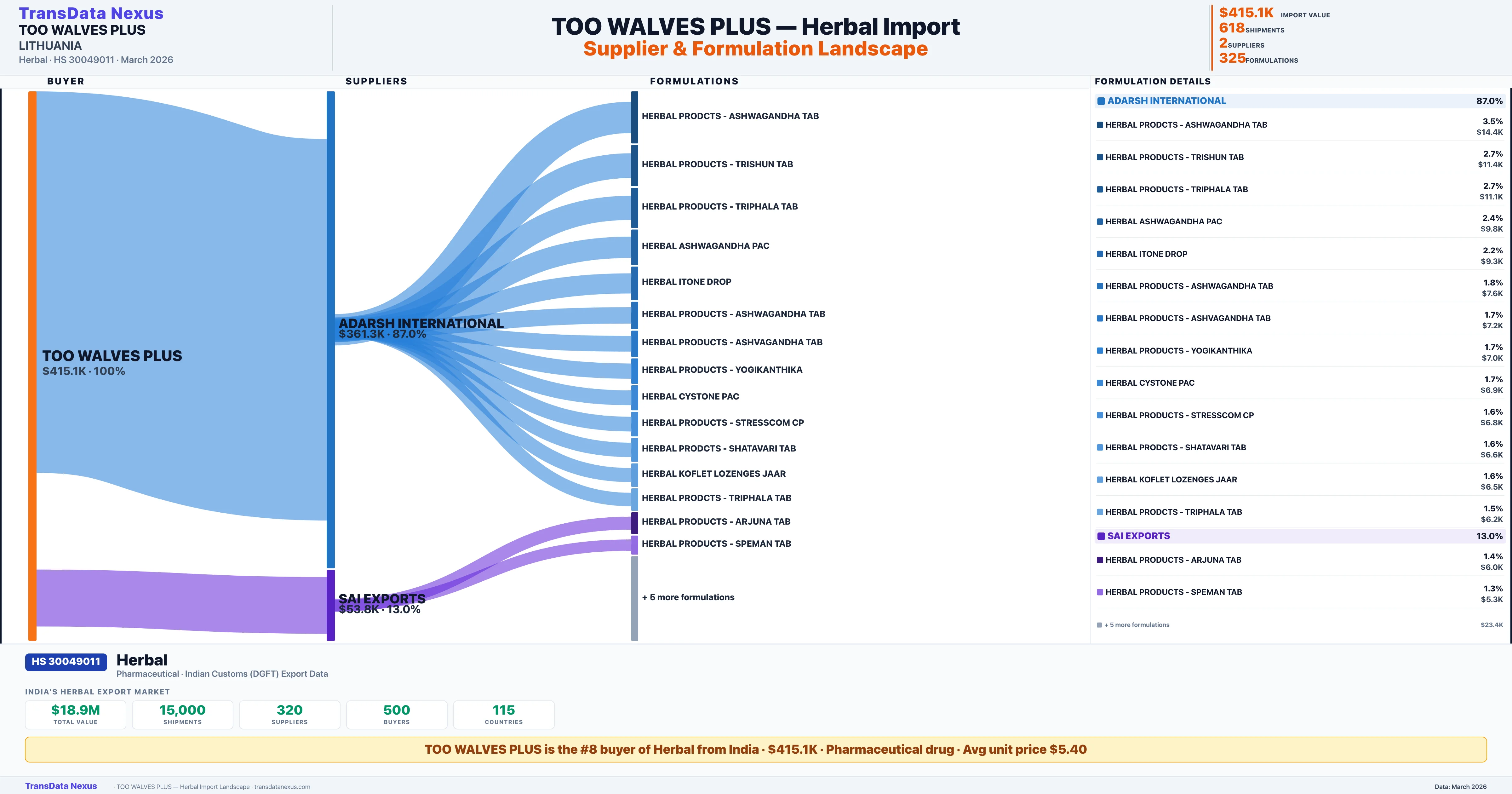 TOO WALVES PLUS sources Herbal from 2 verified Indian suppliers: ADARSH INTERNATIONAL ($361.3K, 87.0%), SAI EXPORTS ($53.8K, 13.0%). This is based on 618 customs records.