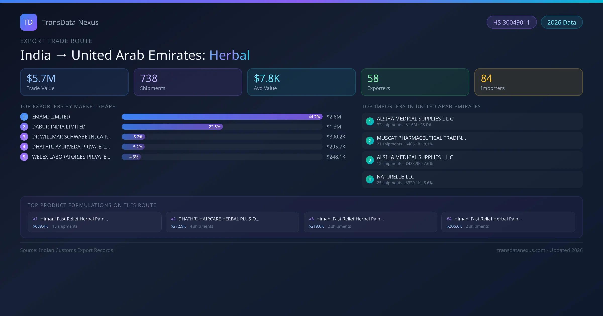 India has recorded 738 verified shipments of Herbal exported to United Arab Emirates, representing a combined trade value of $5.7M USD. This corridor is served by 58 active Indian exporters, with an average shipment value of $7.8K USD. The leading Indian exporter is EMAMI LIMITED, which accounts for 45% of total export value with 68 shipments worth $2.6M USD. On the buying side, ALSIHA MEDICAL SUPPLIES L L C is the largest importer in United Arab Emirates with $1.6M USD in purchases. The top 3 suppliers — EMAMI LIMITED, DABUR INDIA LIMITED, DR WILLMAR SCHWABE INDIA PRIVATE LIMITED — together control 72% of total trade value on this route. All data sourced from Indian Customs (DGFT) shipping bill records. Values reported in FOB USD.