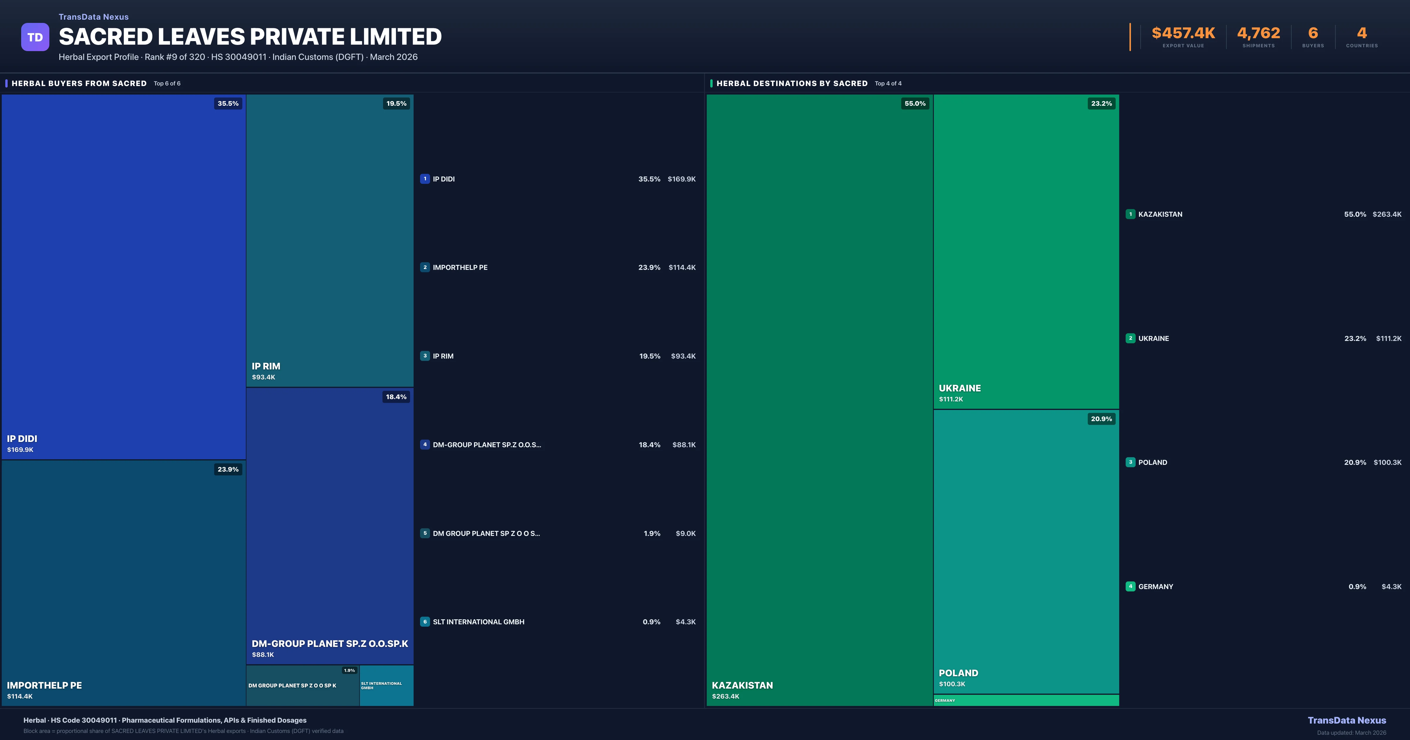 Sacred Leaves Private Limited supplies Herbal to 6 buyers globally. The largest buyer is IP DIDI (KAZAKISTAN), followed by IMPORTHELP PE (UKRAINE) and IP RIM (KAZAKISTAN). These buyers represent pharmaceutical distributors, hospital groups, and government procurement agencies in their respective markets.