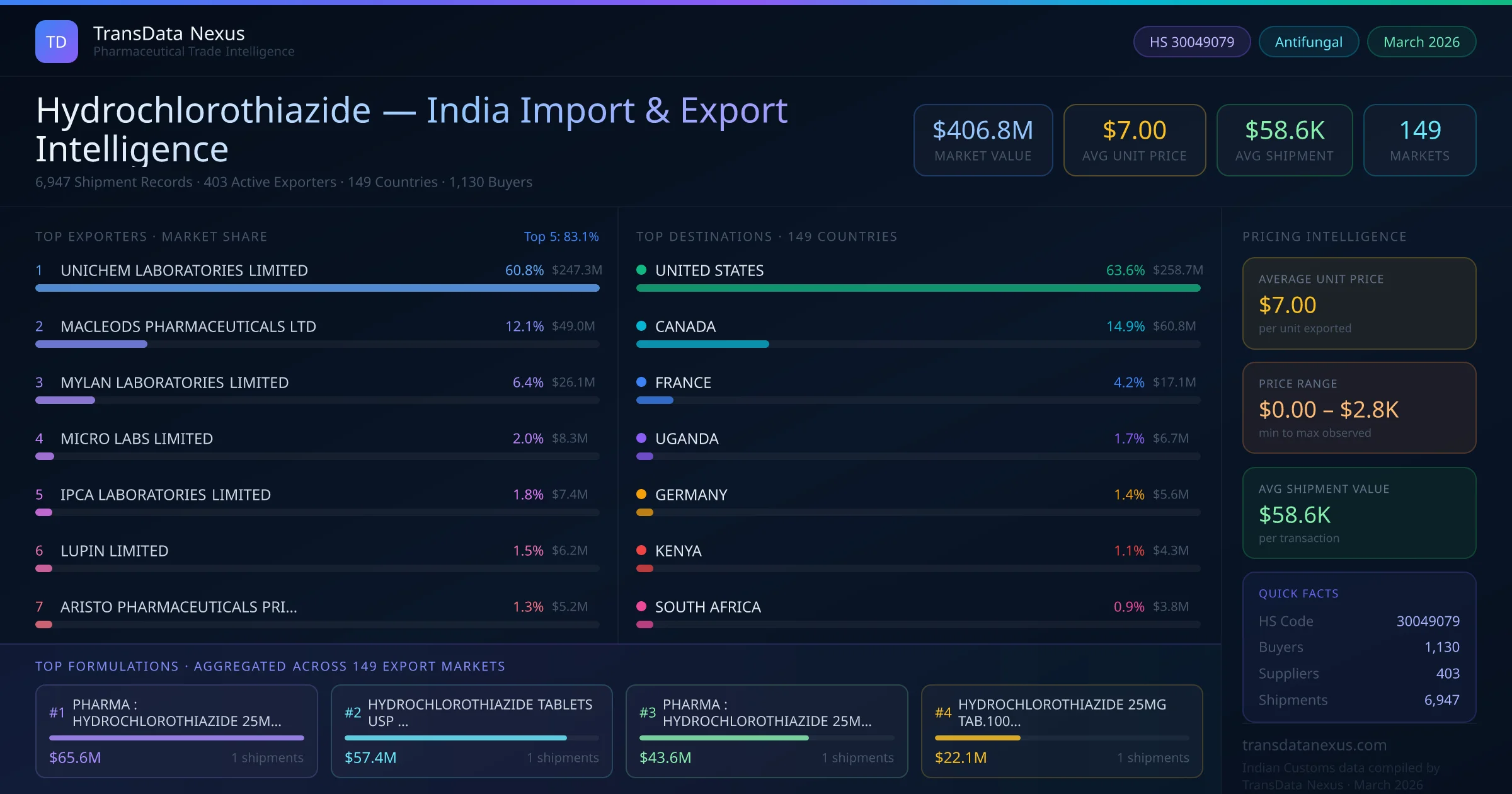 Between 2022 and 2026, India exported $406.8M worth of hydrochlorothiazide across 6,947 verified shipments to 149 countries — covering 76% of world markets in the Diuretics segment. The largest destination is UNITED STATES (63.6%). UNICHEM LABORATORIES LIMITED leads with a 60.8% share. All figures are drawn from Indian Customs (DGFT) shipping bill records spanning four years of trade activity.