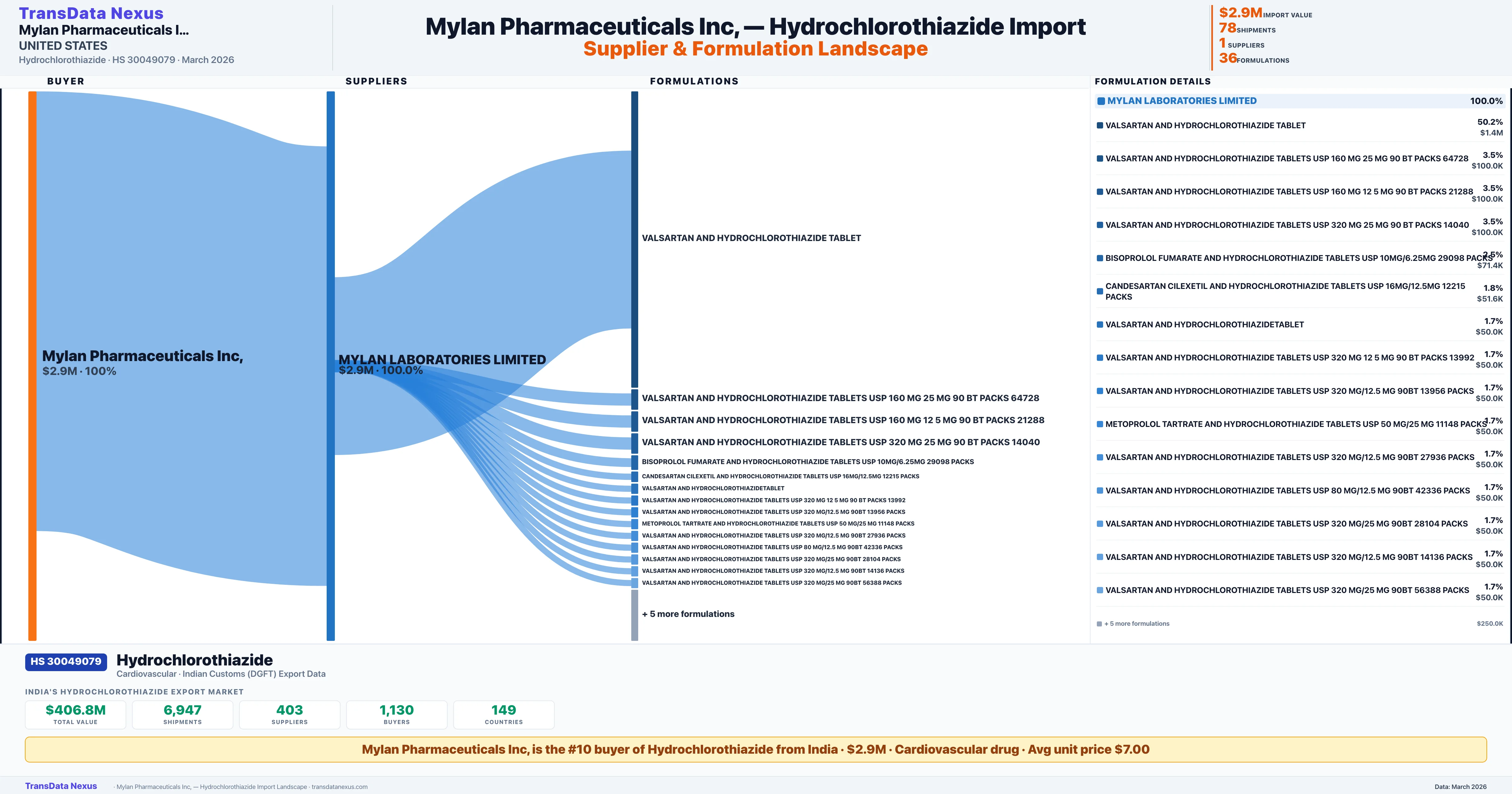 MYLAN PHARMACEUTICALS INC sources Hydrochlorothiazide from 1 verified Indian supplier: MYLAN LABORATORIES LIMITED ($2.9M, 100.0%). This is based on 78 customs records.