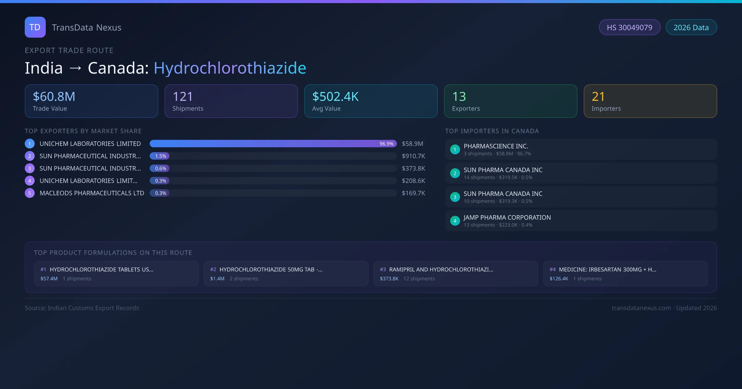 - 1.Route Identification: India to Canada export trade corridor identified from Indian Customs (DGFT) records for Hydrochlorothiazide.