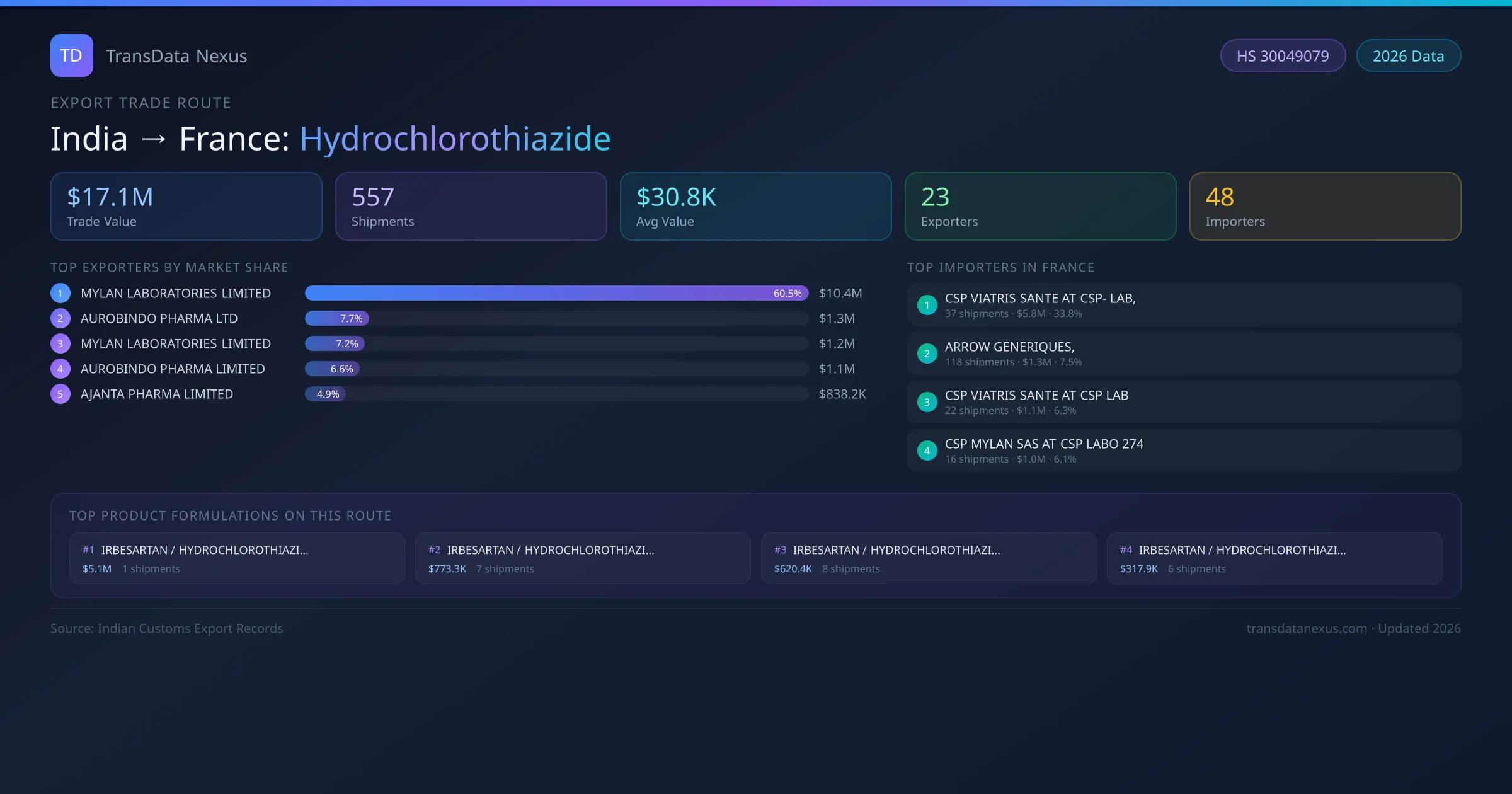 The India to France Hydrochlorothiazide corridor is one of India's established pharmaceutical export routes, with 557 shipments documented worth a combined $17.1M USD. The route is dominated by MYLAN LABORATORIES LIMITED, which alone accounts for roughly 60% of all export value, reflecting the consolidated nature of India's hydrochlorothiazide manufacturing sector.