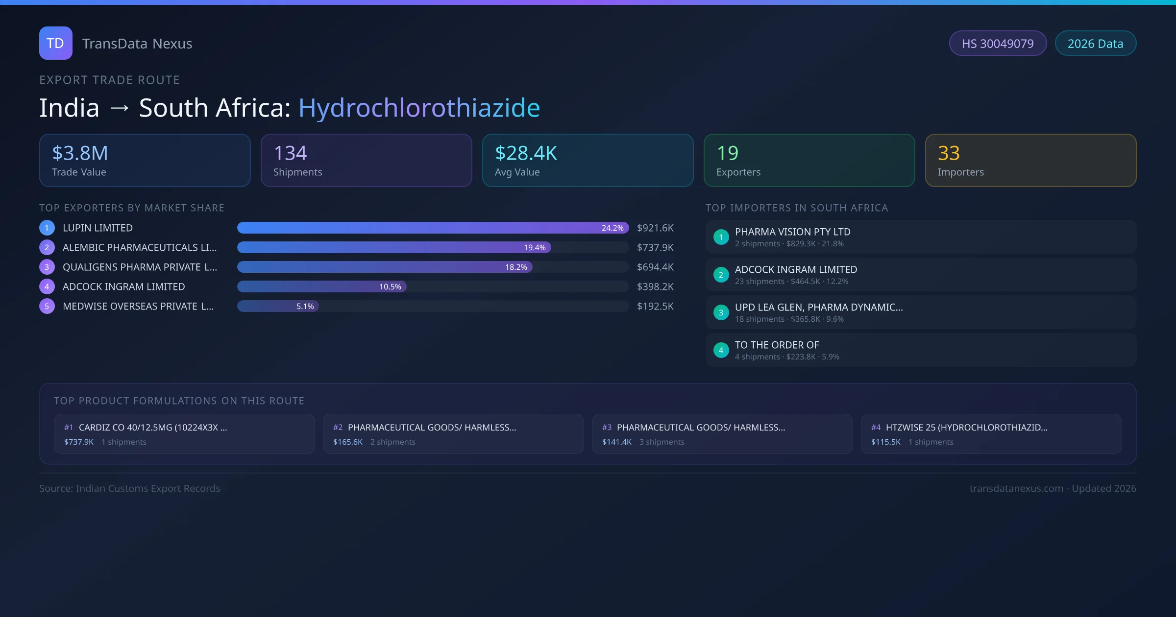 India has recorded 134 verified shipments of Hydrochlorothiazide exported to South Africa, representing a combined trade value of $3.8M USD. This corridor is served by 19 active Indian exporters, with an average shipment value of $28.4K USD. The leading Indian exporter is LUPIN LIMITED, which accounts for 24% of total export value with 37 shipments worth $921.6K USD. On the buying side, PHARMA VISION PTY LTD is the largest importer in South Africa with $829.3K USD in purchases. The top 3 suppliers — LUPIN LIMITED, ALEMBIC PHARMACEUTICALS LIMITED, QUALIGENS PHARMA PRIVATE LIMITED — together control 62% of total trade value on this route. All data sourced from Indian Customs (DGFT) shipping bill records. Values reported in FOB USD.