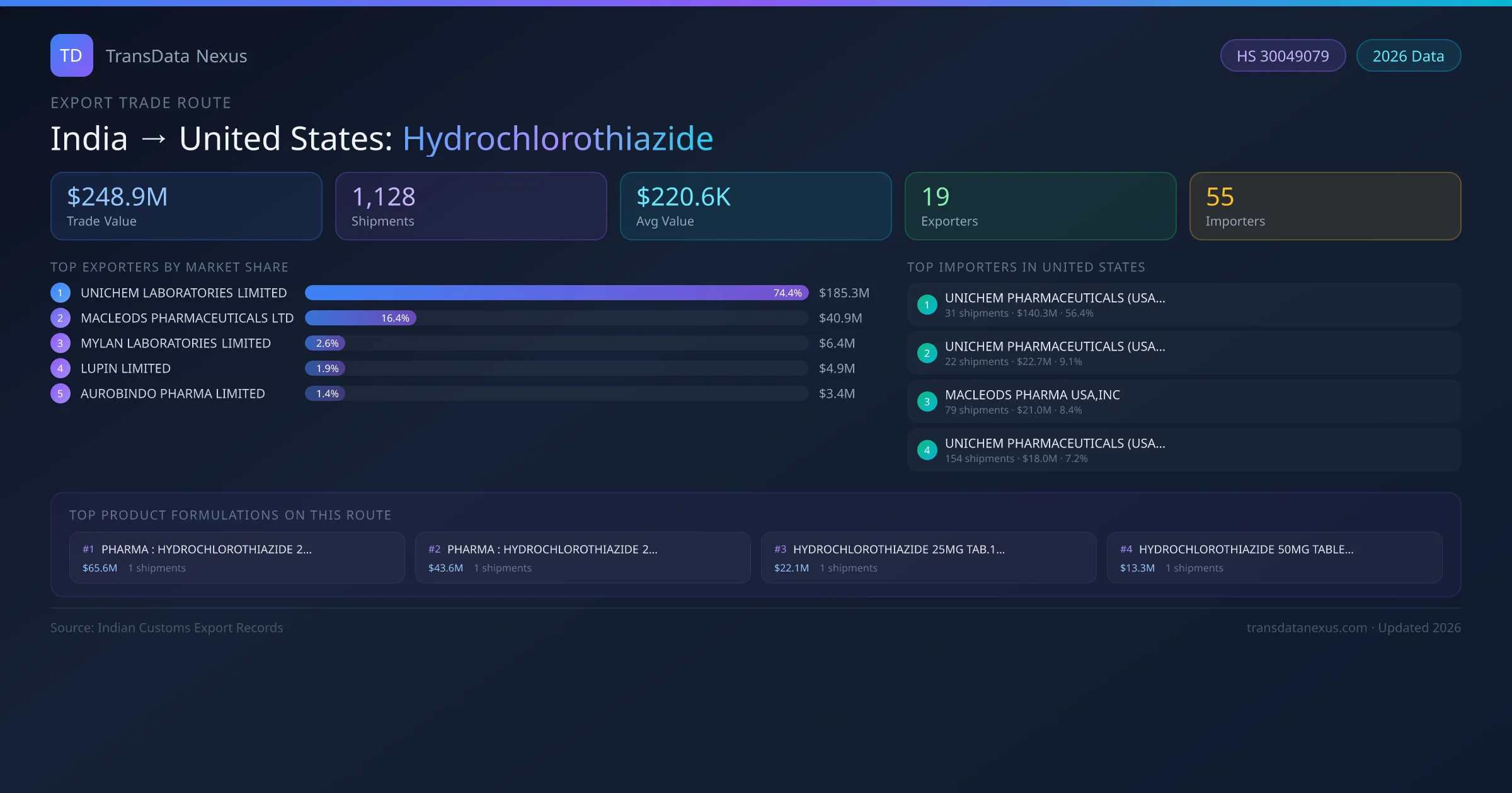 The India to United States Hydrochlorothiazide corridor is one of India's established pharmaceutical export routes, with 1,128 shipments documented worth a combined $248.9M USD. The route is dominated by UNICHEM LABORATORIES LIMITED, which alone accounts for roughly 74% of all export value, reflecting the consolidated nature of India's hydrochlorothiazide manufacturing sector.