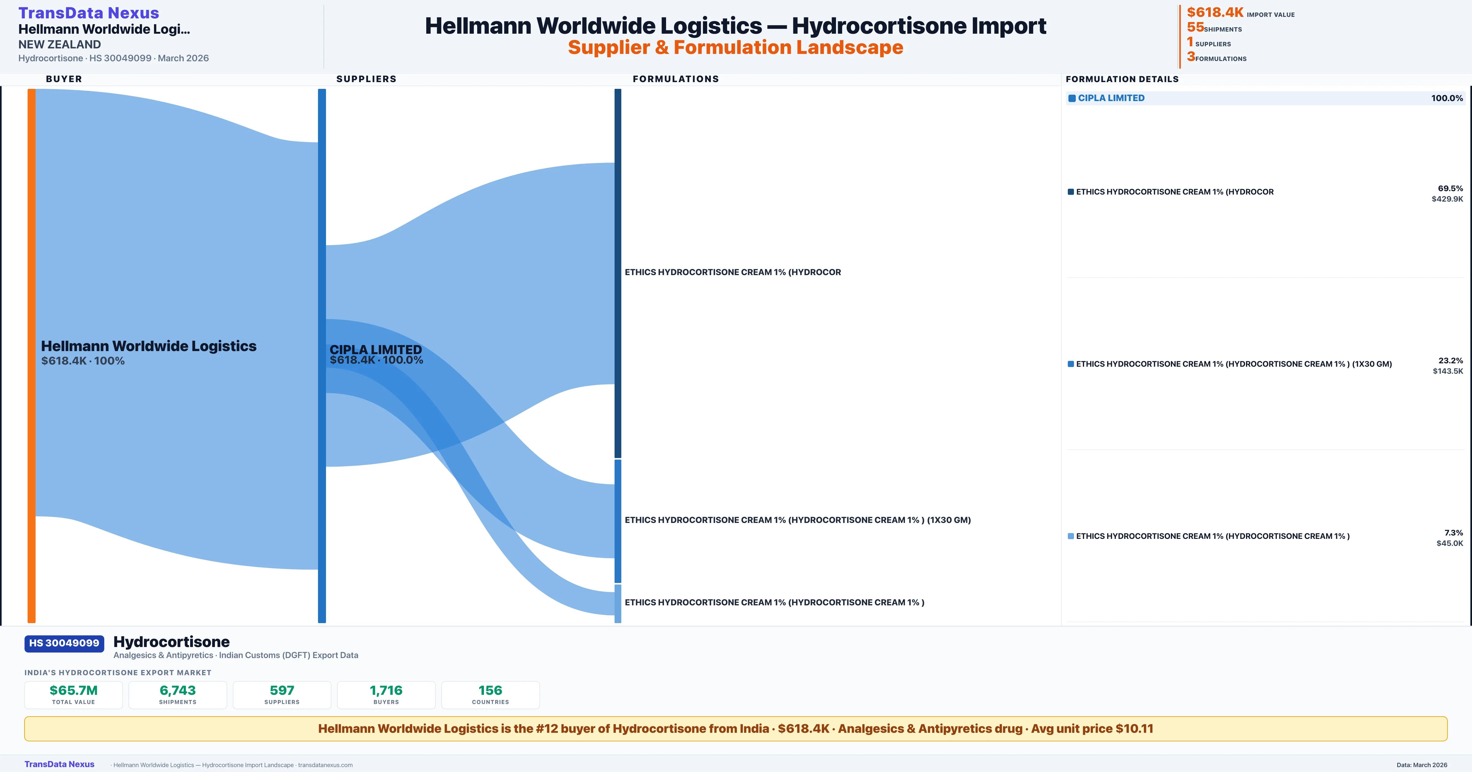 HELLMANN WORLDWIDE LOGISTICS sources Hydrocortisone from 1 verified Indian supplier: CIPLA LIMITED ($618.4K, 100.0%). This is based on 55 customs records.